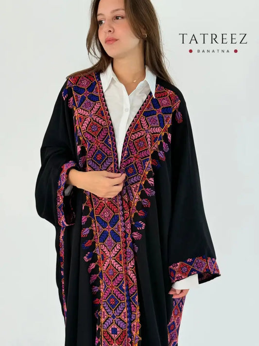 Maha Black Crepe Georgette Abaya/Bisht – Handmade Palestinian Tatreez