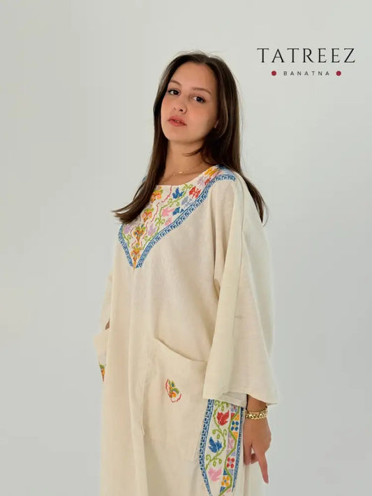 Off White Fusion Abaya Thoub – Handmade Palestinian Tatreez