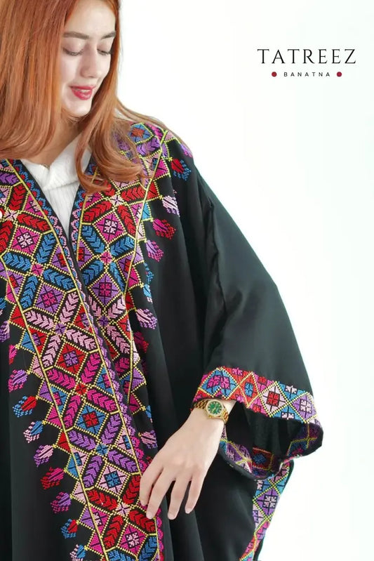 Maha - Wild Cow: Elegant Black Crepe Georgette Abaya/Bisht with Handmade Embroidery