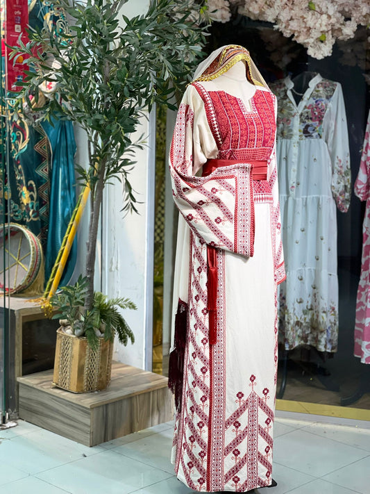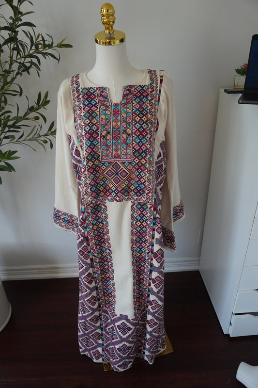 ثوب أوف وايت فاخر من تصميم يطاوية للتراث الأصيل بتطريز نابض بالحياة بألوان الأزرق والفوشيا والأخضر والأخضر الفاتح والوردي والبنفسجي الداكن