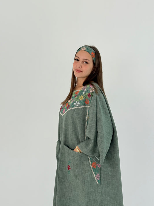 عباية فستان من الكتان الأخضر مع تطريز زهور وطرحة متناسقة