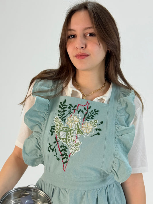 مريلة بوبلين مطرزة مقاومة للماء باللون الأخضر مع خريطة فلسطين