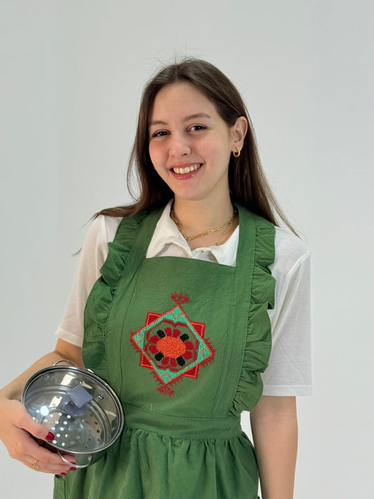 مريلة بوبلين مطرزة مقاومة للماء باللون الأخضر مع أزهار