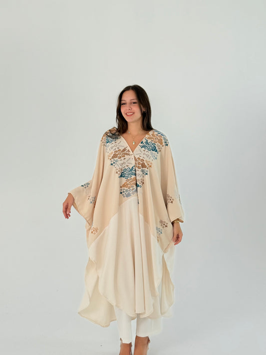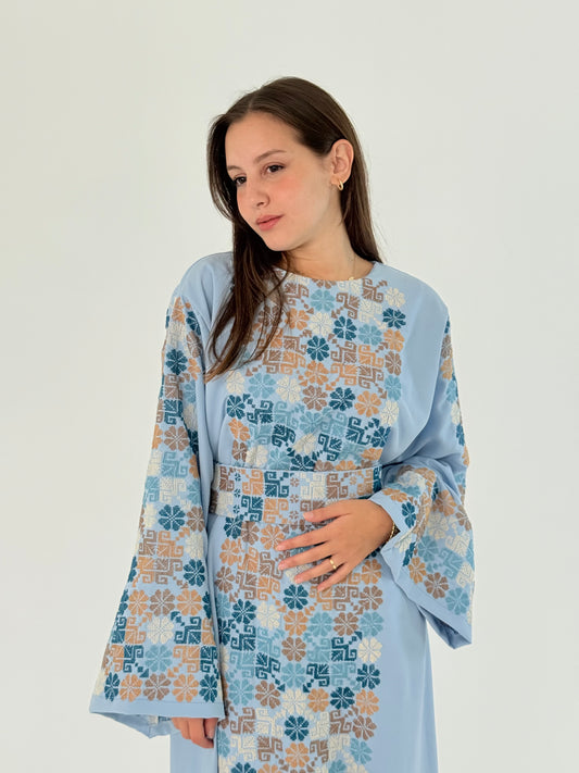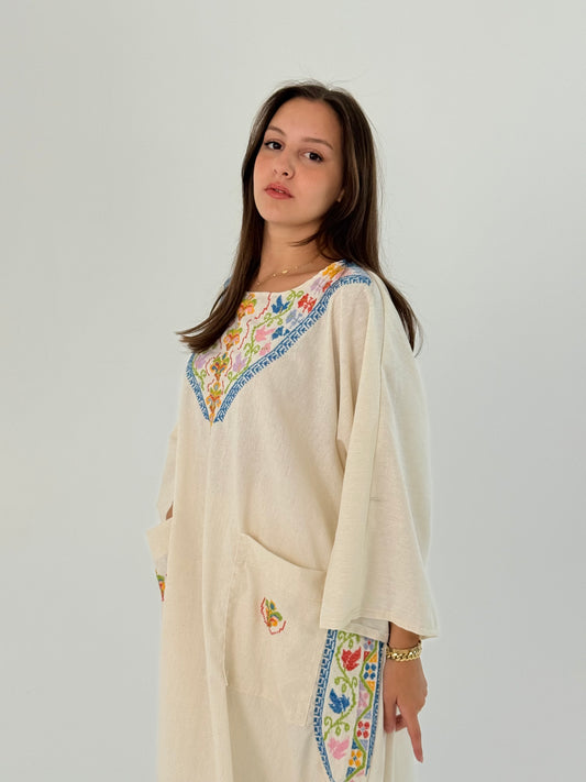 عباية ثوب فيوجن يدوية بلون أبيض مائل مع تطريز فلسطيني - مناسبة للارتداء اليومي والفعاليات