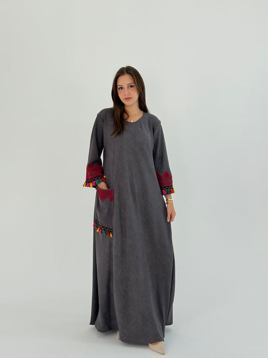 فستان رمادي من الكتان مصنوع يدويًا مع تطريز أحمر وشراشيب