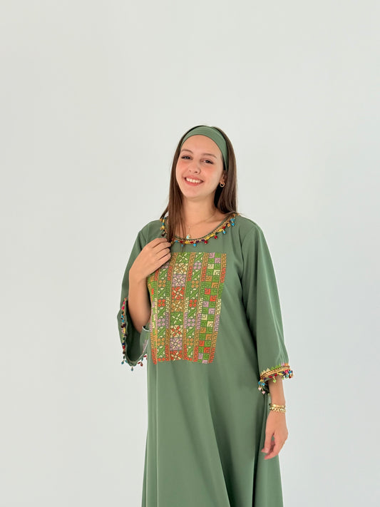 عباية فستان من الكتان الأخضر مع تطريز زهور وطرحة متناسقة