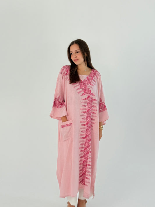 عباية من الكتان الوردي الناعم يدوية الصنع مع تطريز تراث - أنيقة ومريحة