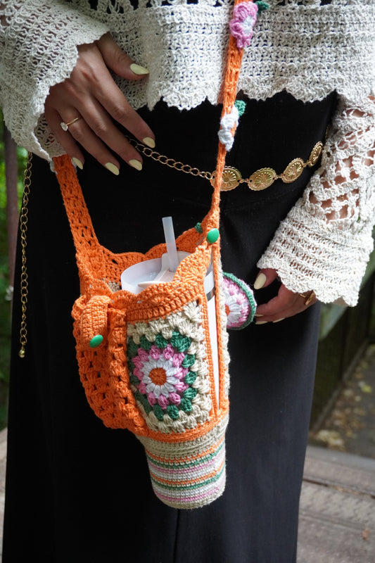 غطاء زجاجة ستانلي محبوك يدويًا - زهور برتقالية مع تركيبة خضراء وبيضاء | يناسب 30 أونصة