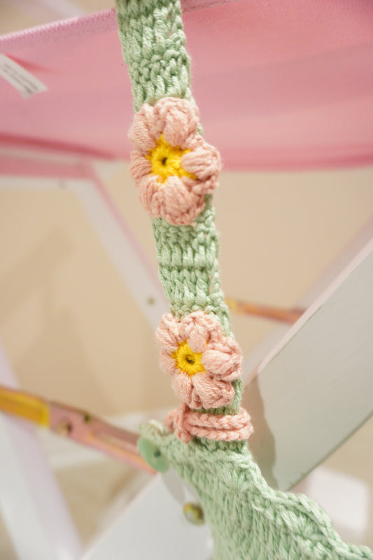 حامل كروشيه يدوي لزجاجة ستانلي ٣٠ أونصة – أخضر زاهي بزهور وردية وجيب أمامي