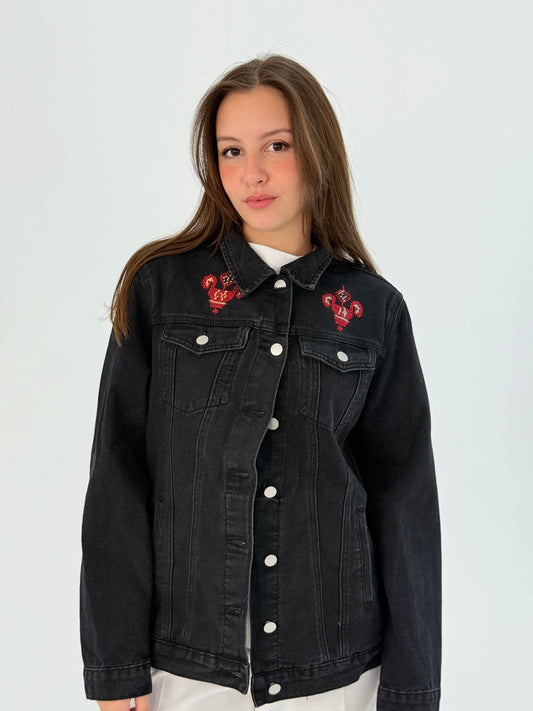 سترة جينز سوداء بتطريز رائع بألوان زاهية - إبداع يفيض بالشغف.