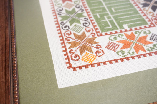 نحن باقون ما بقي الزعتر والزيتون" – معلقة جدارية مطرزة "سنبقى ما دام الزعتر والزيتون باقيين"