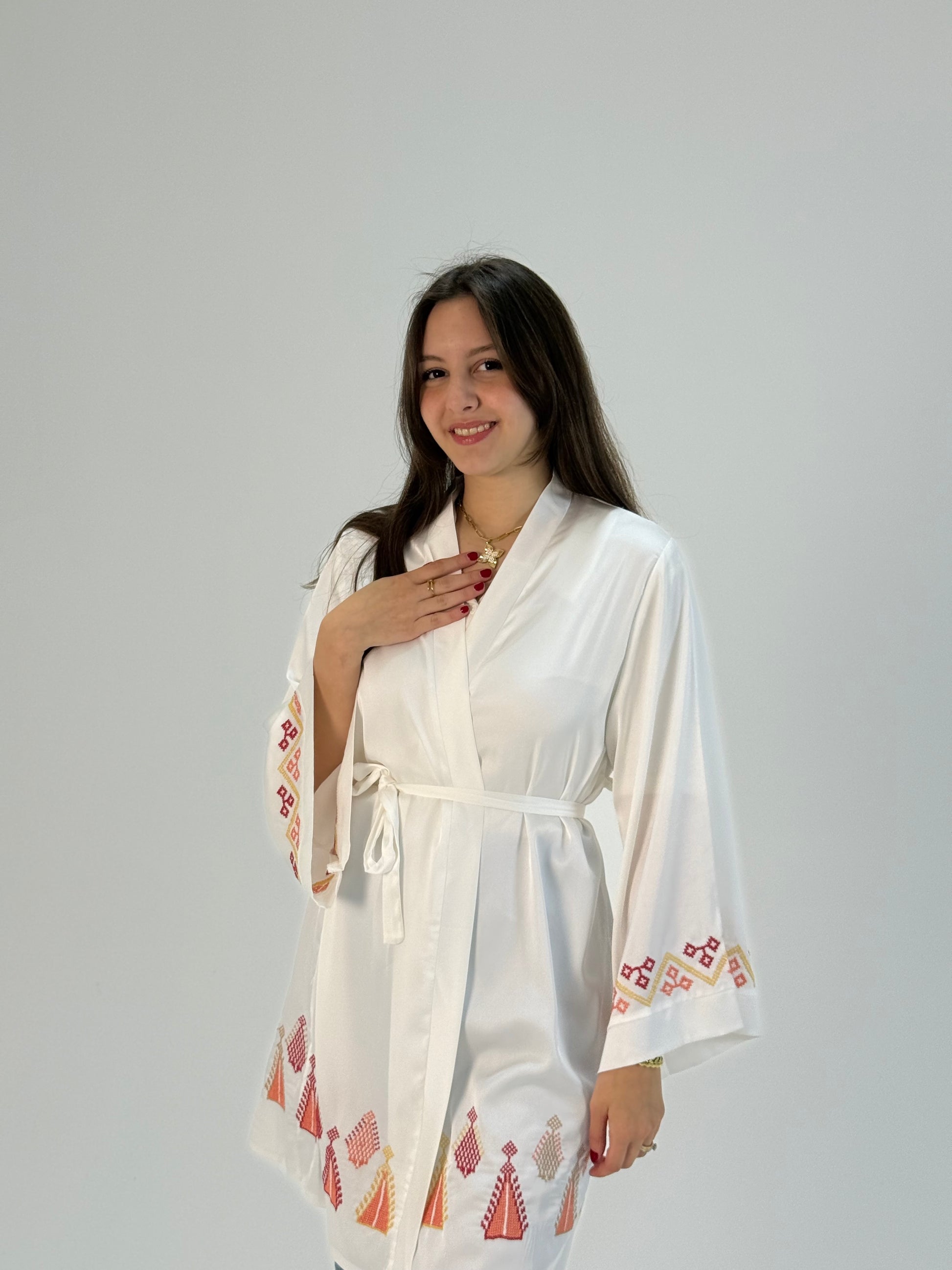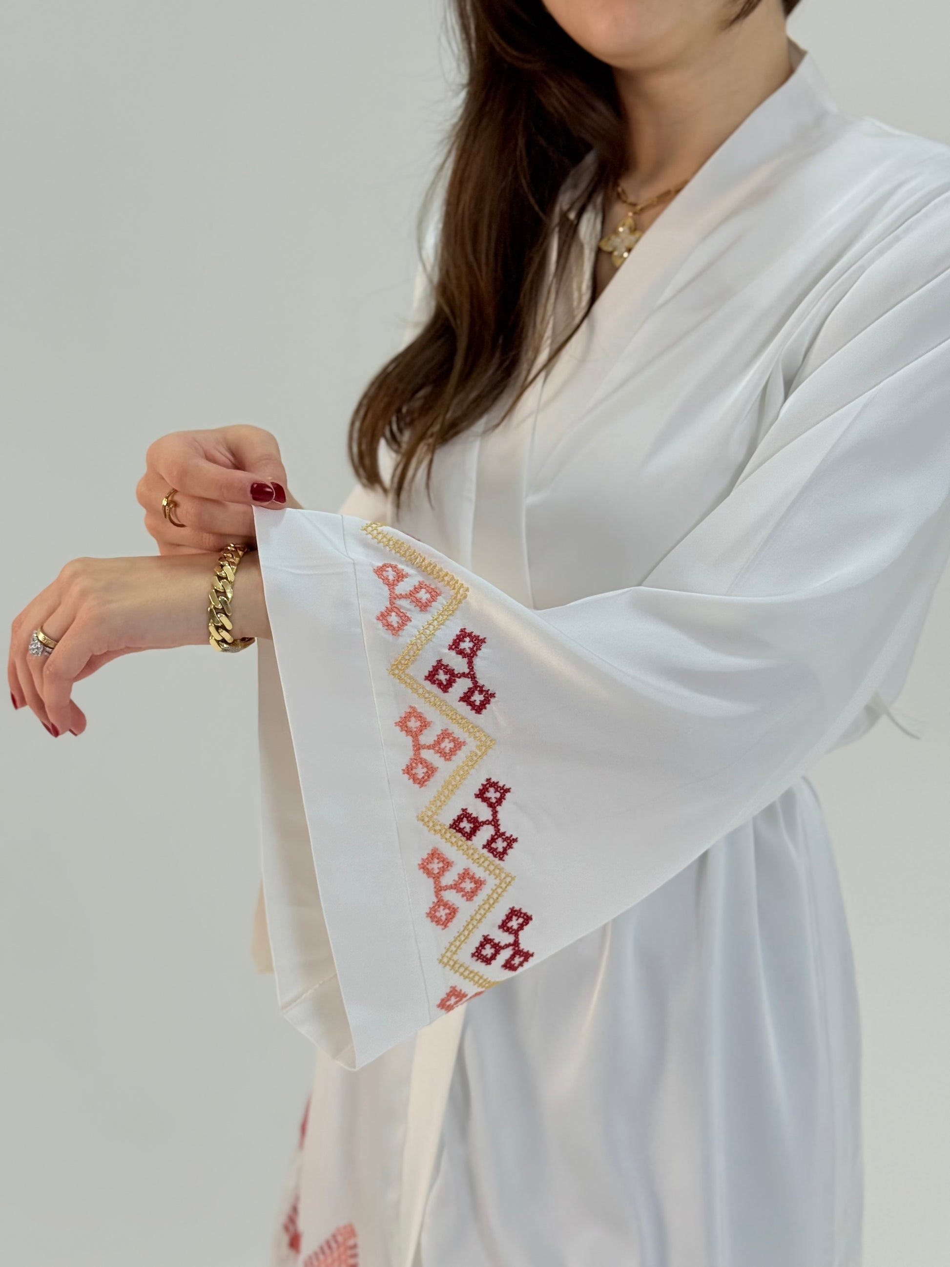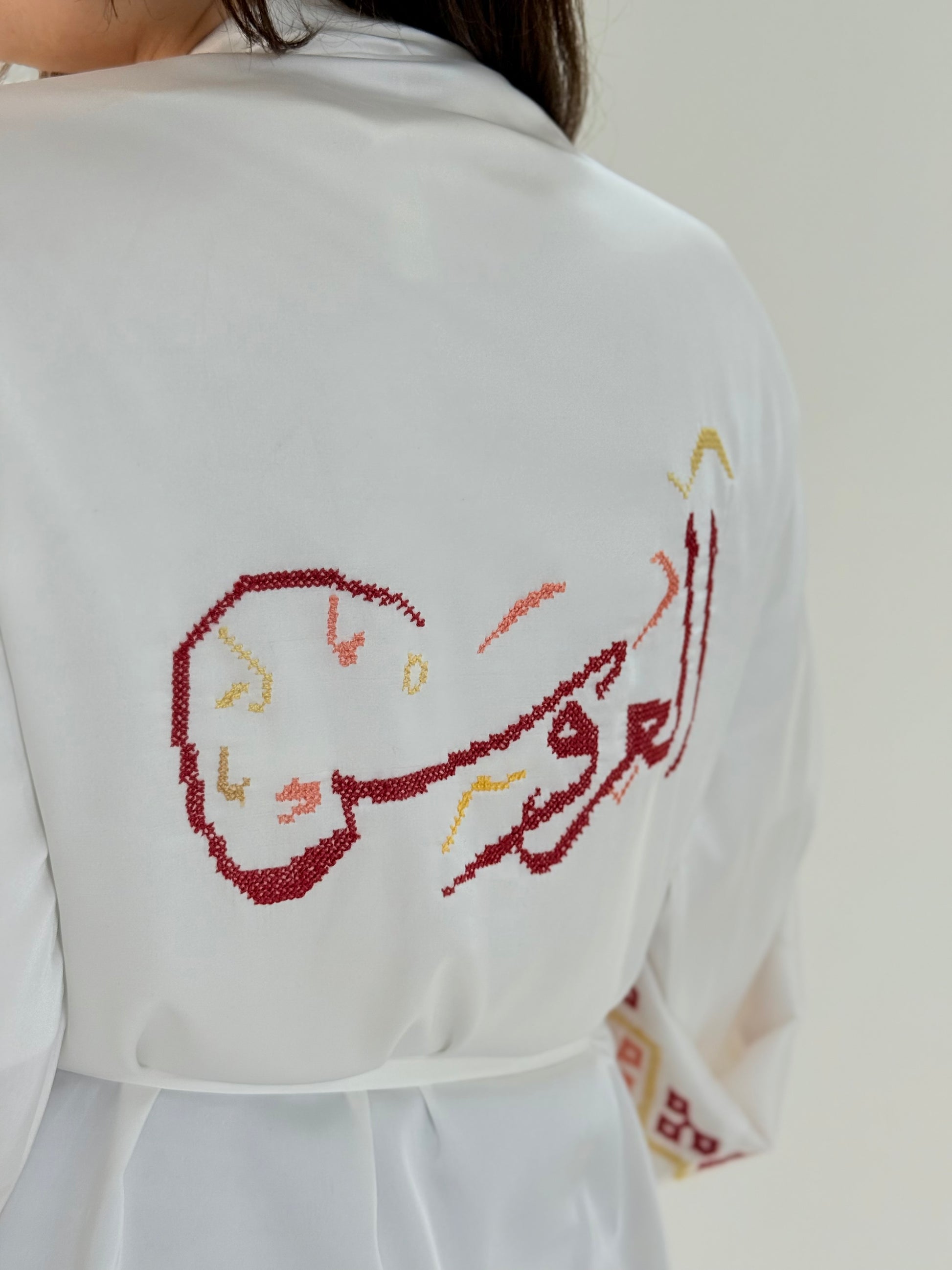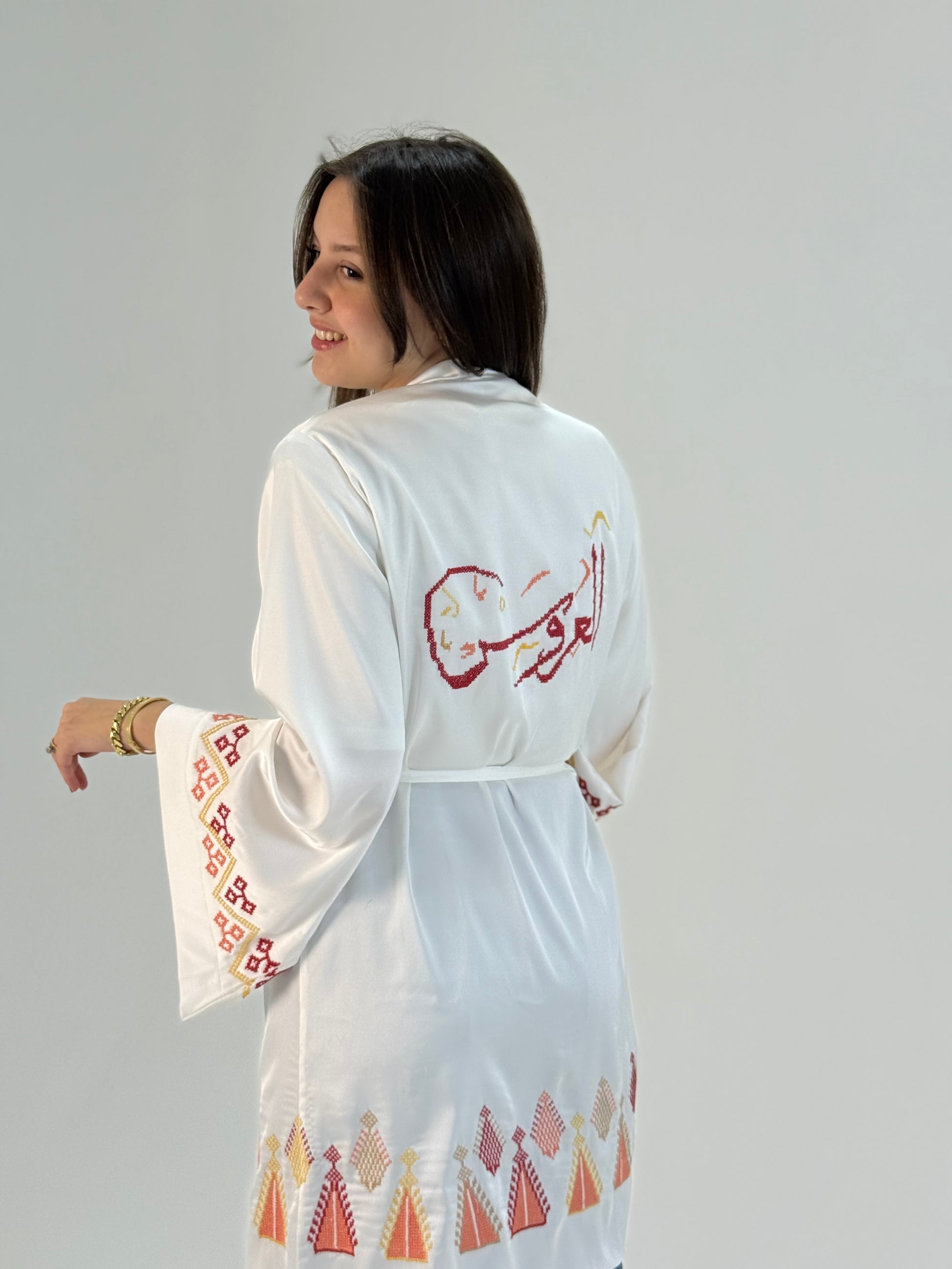 رداء زفاف أبيض من الحرير التركي الناعم، مطرز يدويًا بخطوط عربية بخيوط DMC حمراء وذهبية، تُشكل كلمة "عروس" باللغة العربية. ناعم، يسمح بمرور الهواء، وأنيق بلمسة عصرية - مثالي للاستعداد أو للاحتفاظ به كتذكار مميز.