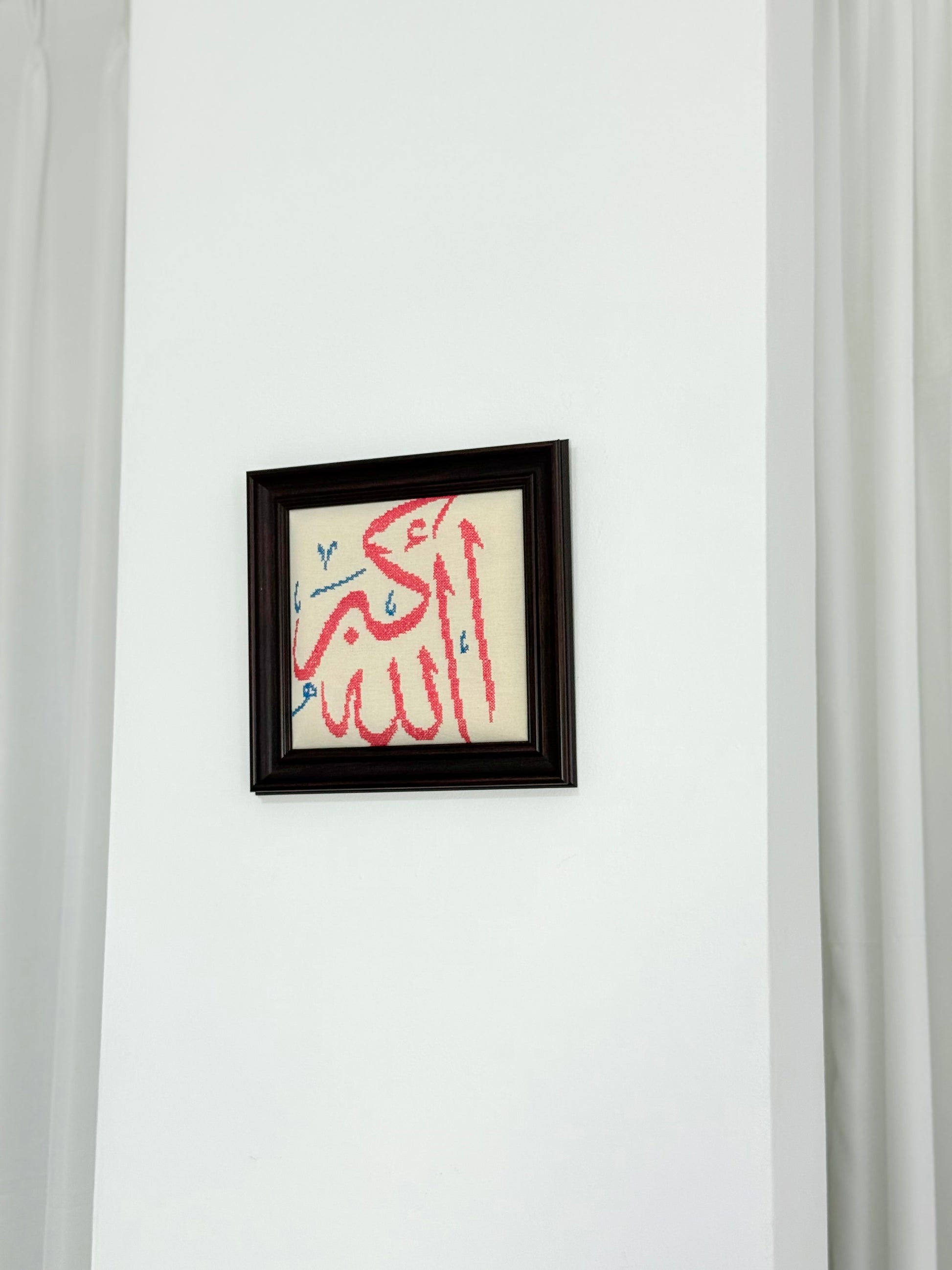 تتميز هذه القطعة اللافتة بعبارة " الله أكبر" العربية القوية، وهي إعلان خالد عن الإيمان والقوة والتبجيل في الإسلام. مطرزة بخيط DMC وردي جريء مع علامات حروف العلة الزرقاء الفاتحة الرقيقة، ليقدم التصميم تعبيرًا حيويًا ومتوازنًا عن الإخلاص.