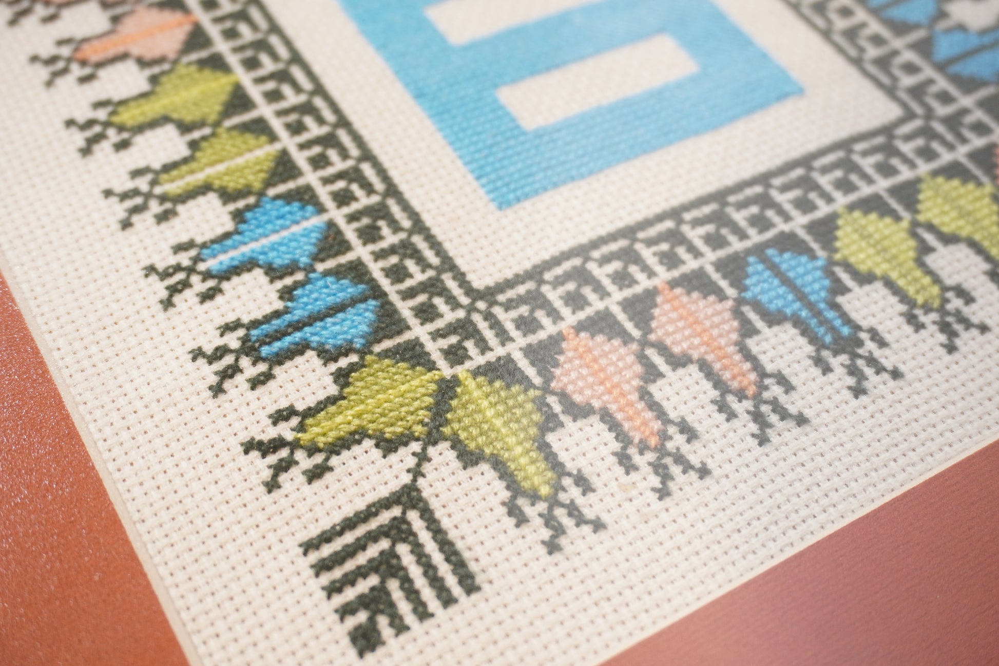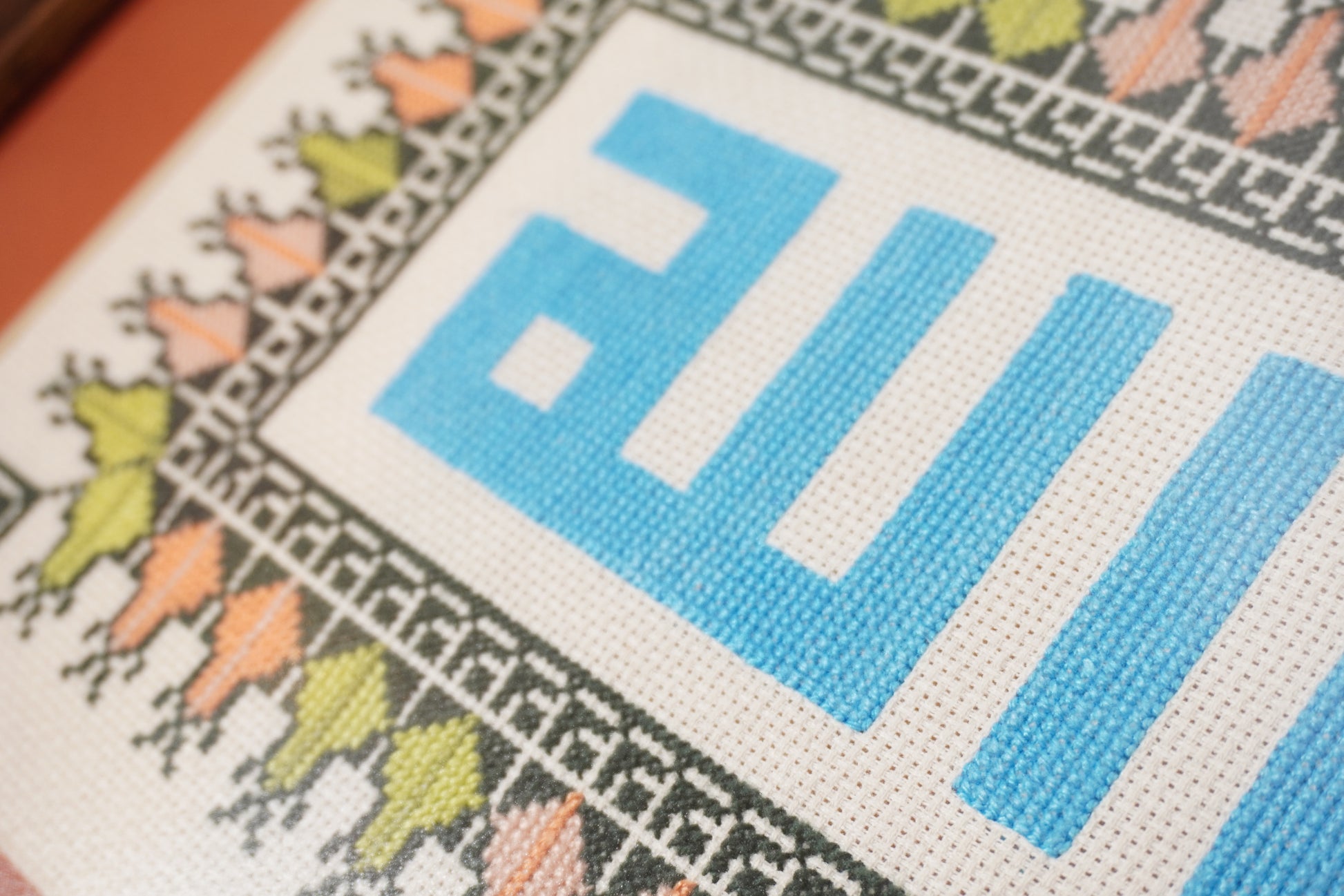 تتميز هذه القطعة بخط كوفي مربع تقليدي، مطرز بألوان راقية من الأسود والبني والأزرق الباهت على قماش إتامين ناعم بلون أبيض عاجي. يعكس النمط الهندسي المحكم التصميم الحديث والتراث الإسلامي.