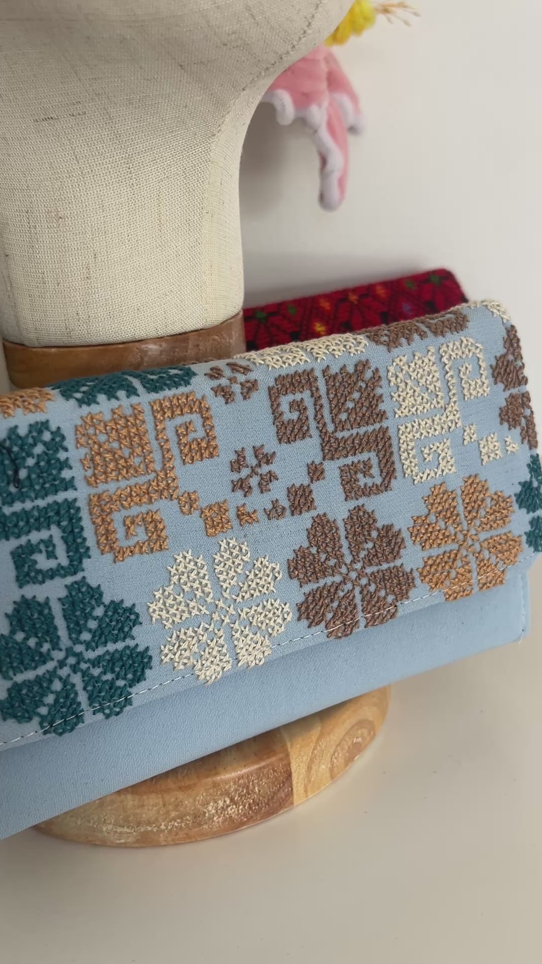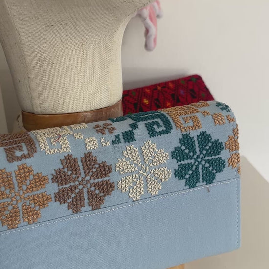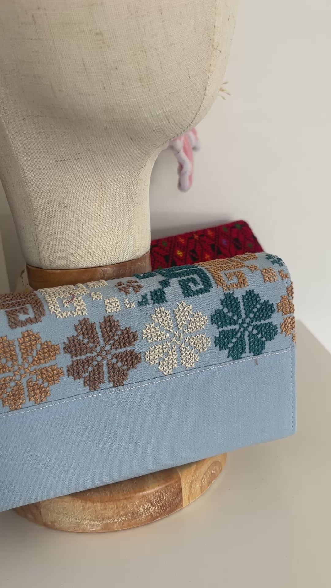 مصنوعة من خيوط DMC الرفيعة، تعكس هذه الحقيبة حرفية استثنائية. الفتحة مزينة بتطريز تقليدي جميل، مخيط بألوان زرقاء مذهلة، مما يضيف لمسة من الفن الثقافي إلى التصميم.