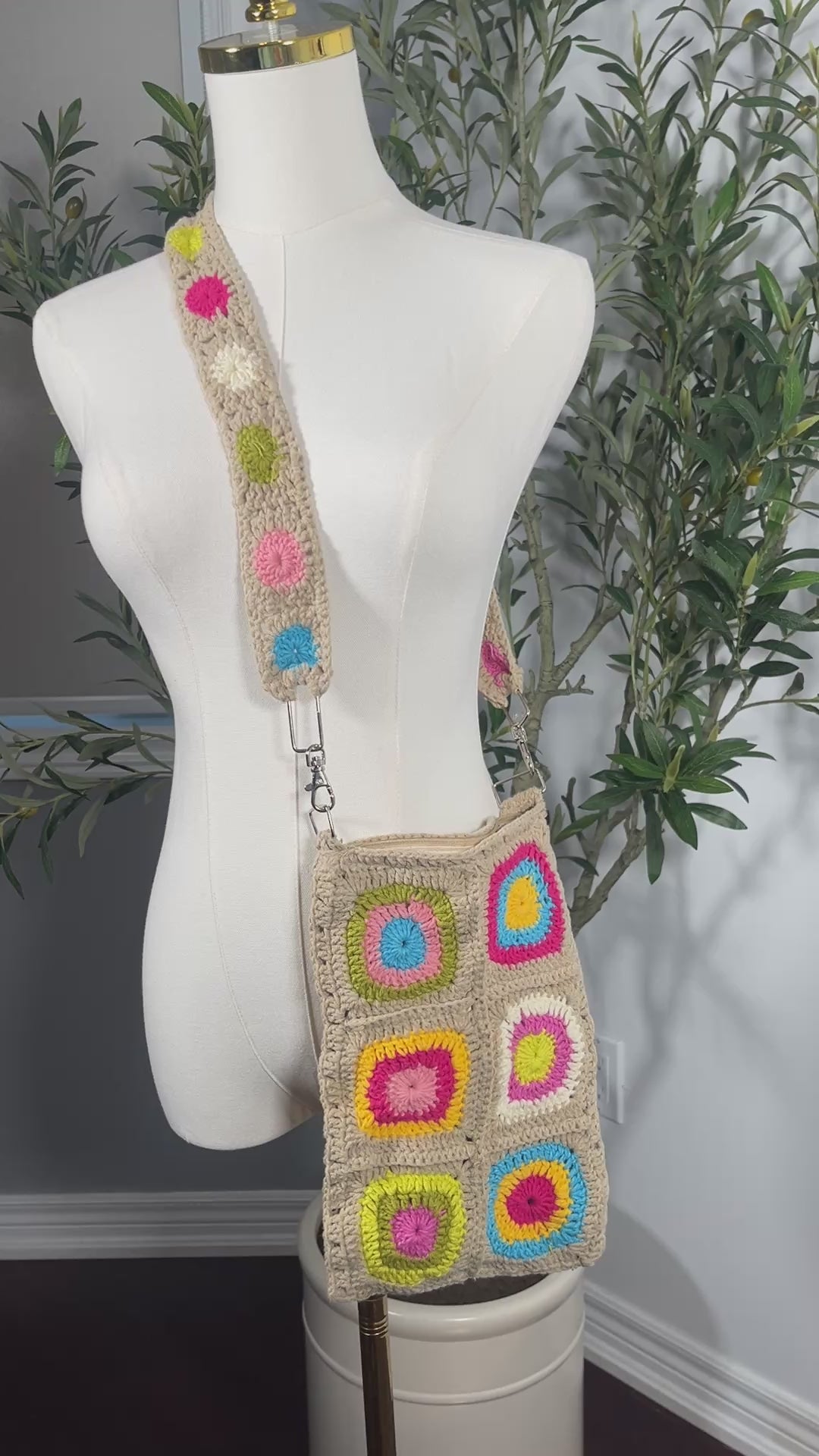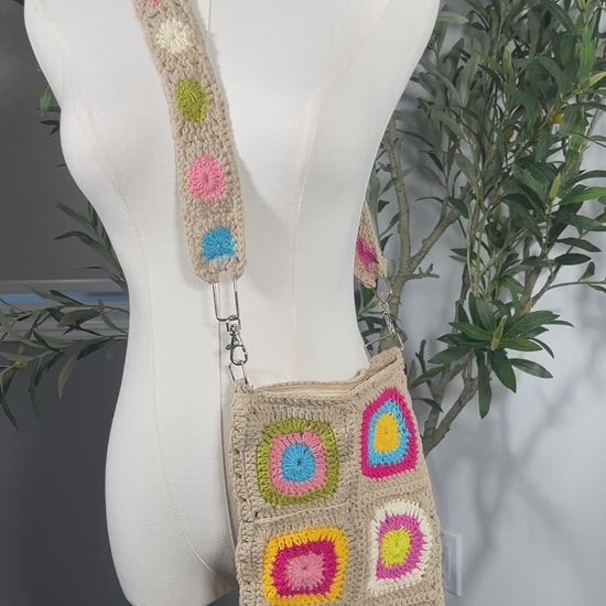 ارتقِ بأناقتك مع حقيبتنا الكروشيه اليدوية الفريدة من نوعها باللون البيج الفاتح، والتي تتميز بمجموعة رائعة من مربعات الكروشيه بألوان الأخضر الفاتح، والوردي الفاتح، والأصفر، والبنفسجي، والزيتوني، والأزرق النابض بالحياة. مع حزام قابل للإزالة وإغلاق بسحاب آمن، هذه الحقيبة مثالية للاستخدام اليومي أو كإكسسوار أنيق يجمع بين الوظائف واللمسة الفنية.