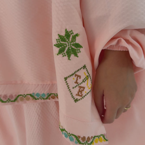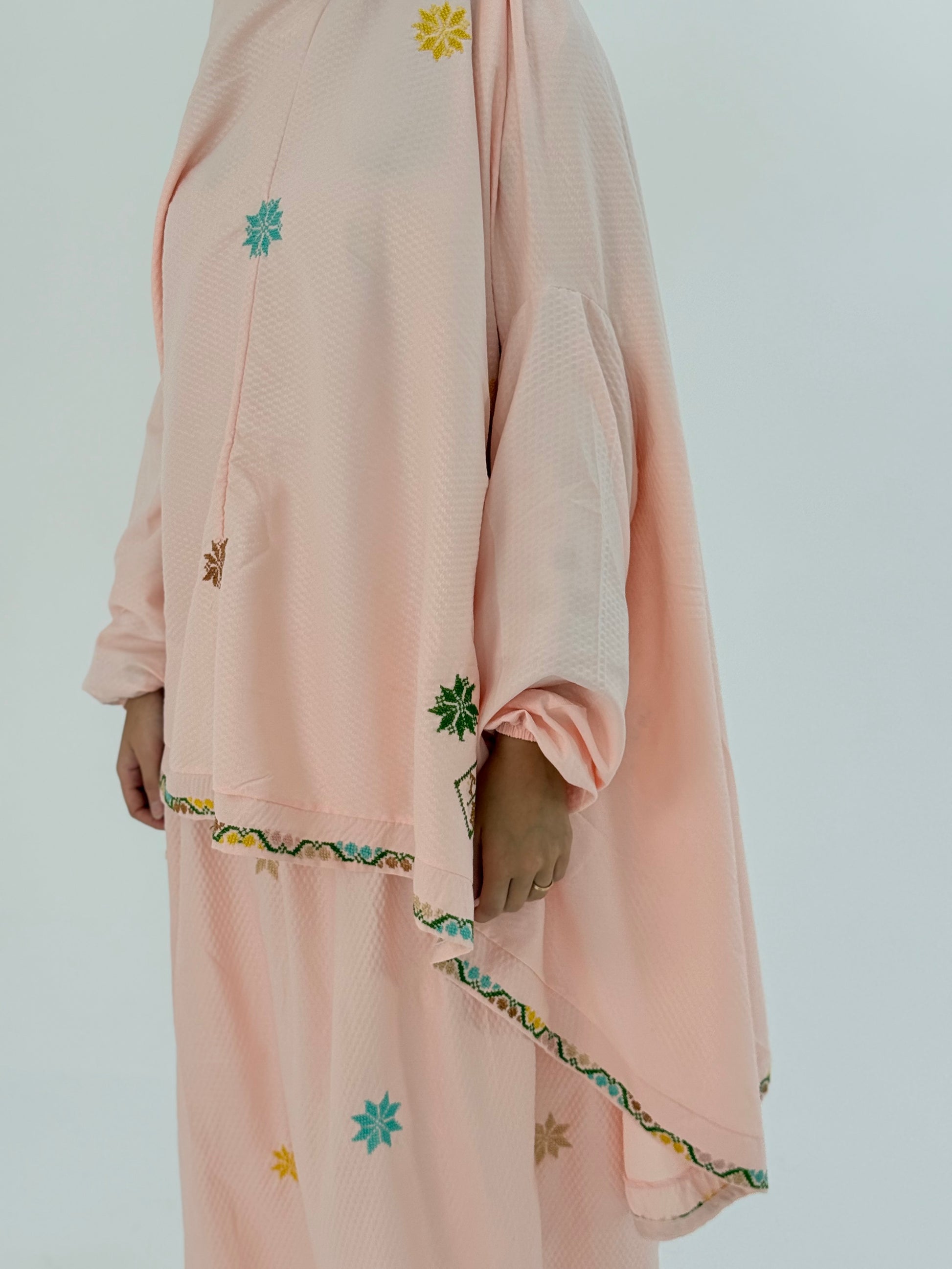 طقم صلاة يدوي أنيق باللون الخوخي مع تطريز على شكل نجوم وأكمام | طقم من قطعتين مع خمار وتنورة