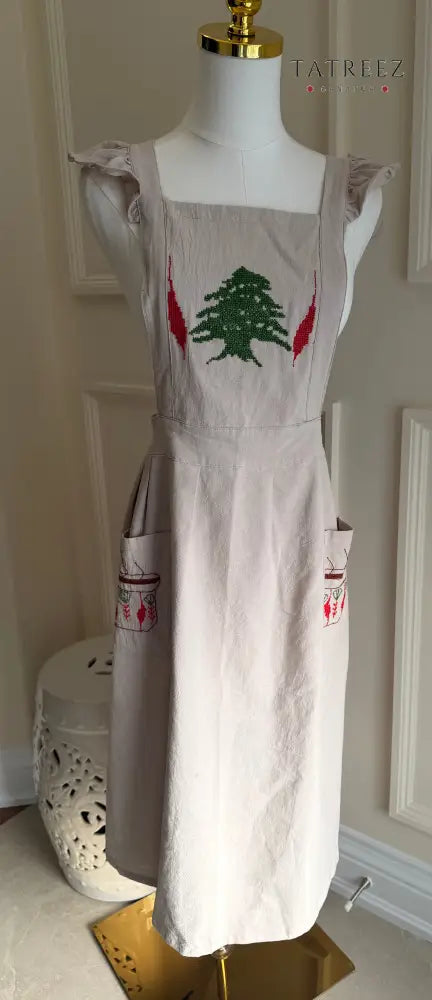 ARZ Apron: Handcrafted Light Beige with Lebanese Arz Tree & Finjan Embroidery