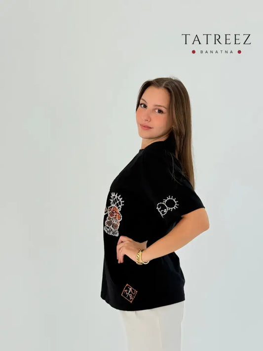 Black Cotton T-shirt with Handhala Family Embroidered in White and Beige