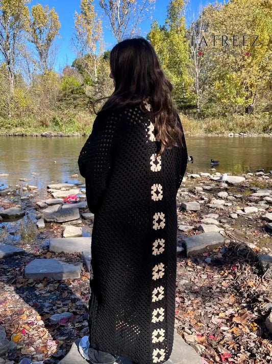Black Crochet Cardigan with Cream Motifs | Tatreez Banatna