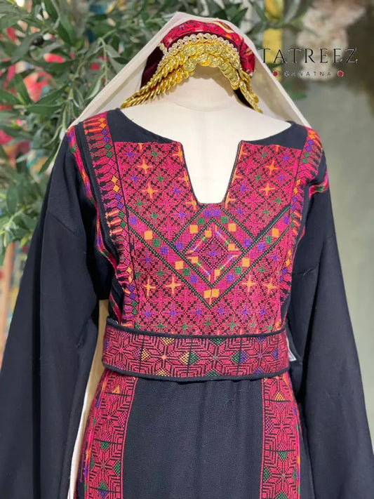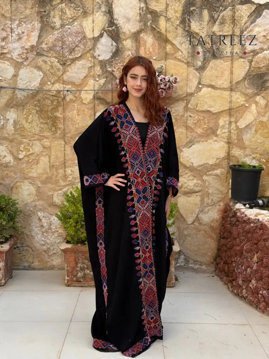 Stunning Handmade Black Thoub with Vibrant Palestinian Embroidery from Yata Al Khalil
