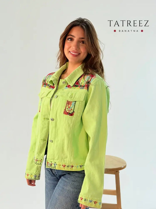 Stylish Pistachio Green Jeans Jacket with Handmade Front and Back Embroidery | Artisan Fashion