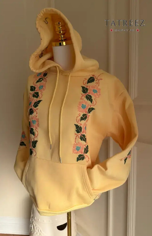 Sunny Yellow Hoodie – Hand-Embroidered Floral Palestinian Tatreez