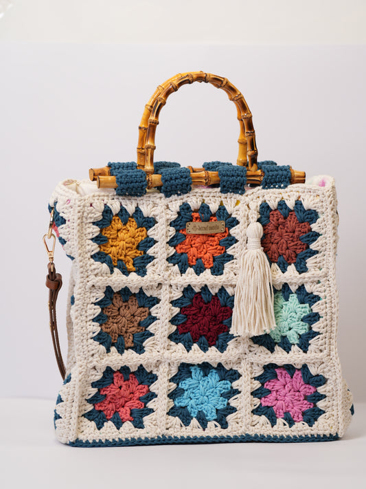 Handmade Crochet Granny Square Bag – Teal & Off-White | Tatreez Banatna