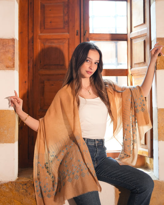 Camel Pashmina Embroidered Shawl | Tatreez Banatna
