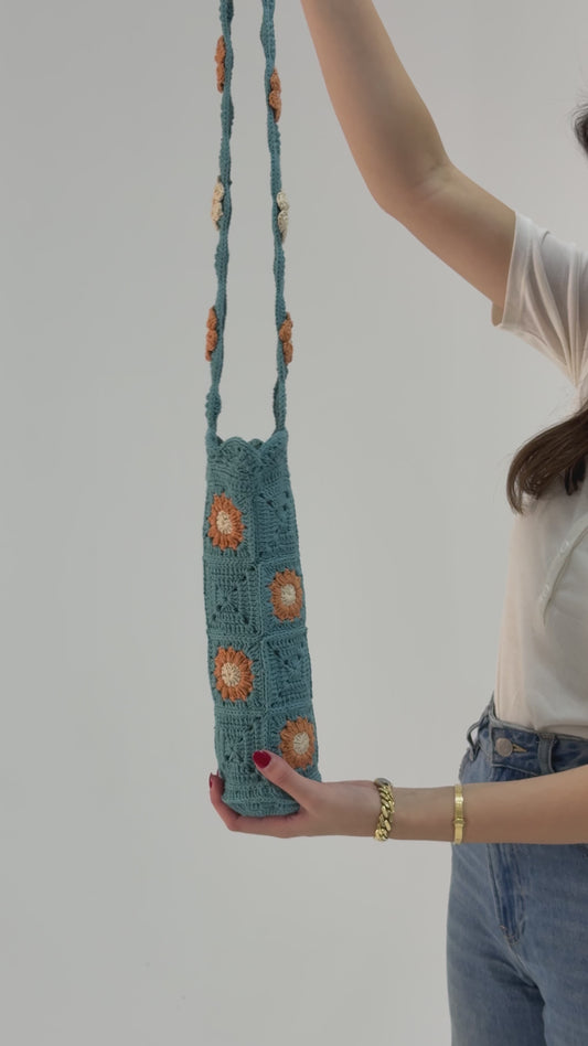 Crochet Bottle Holder | Blue & Orange Geometric | Tatreez Banatna