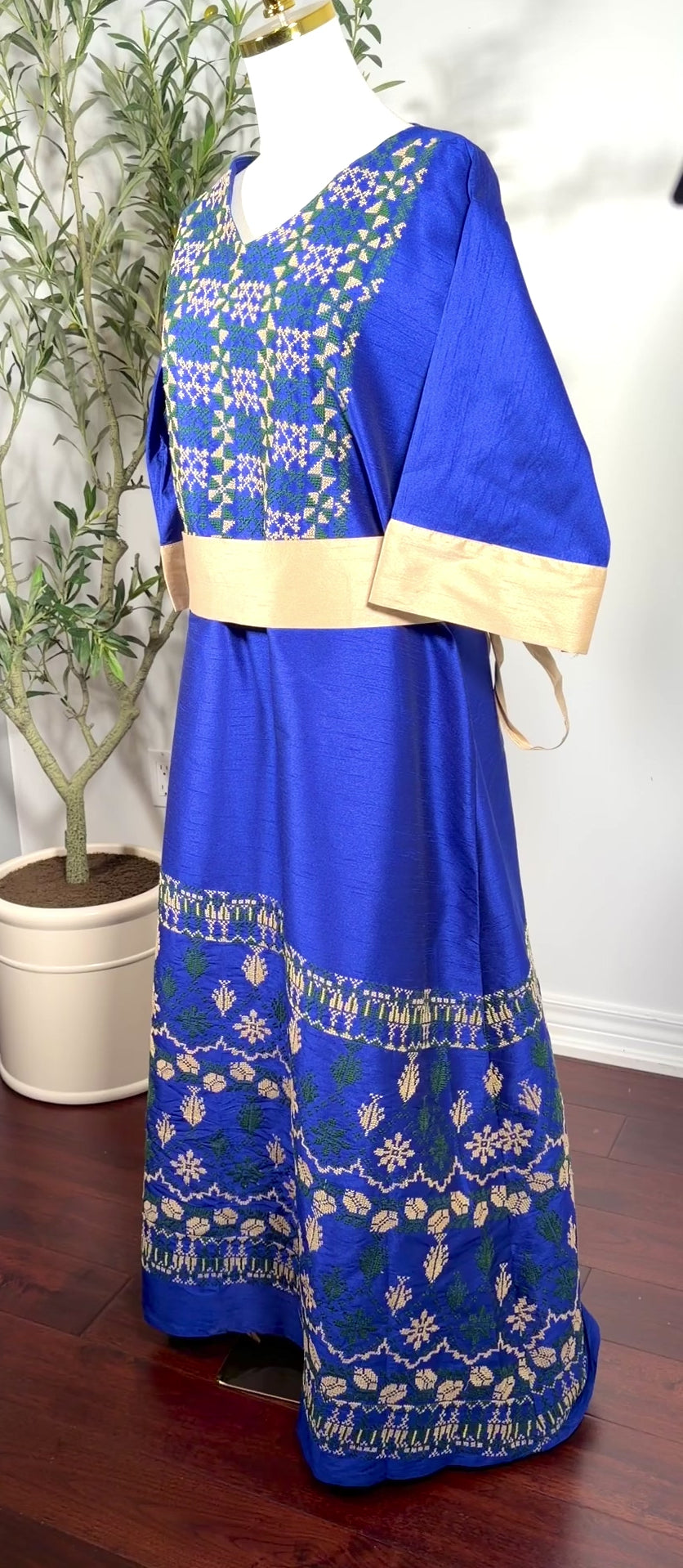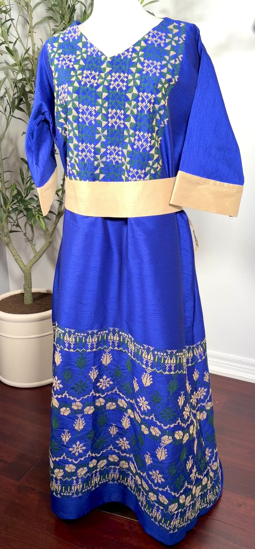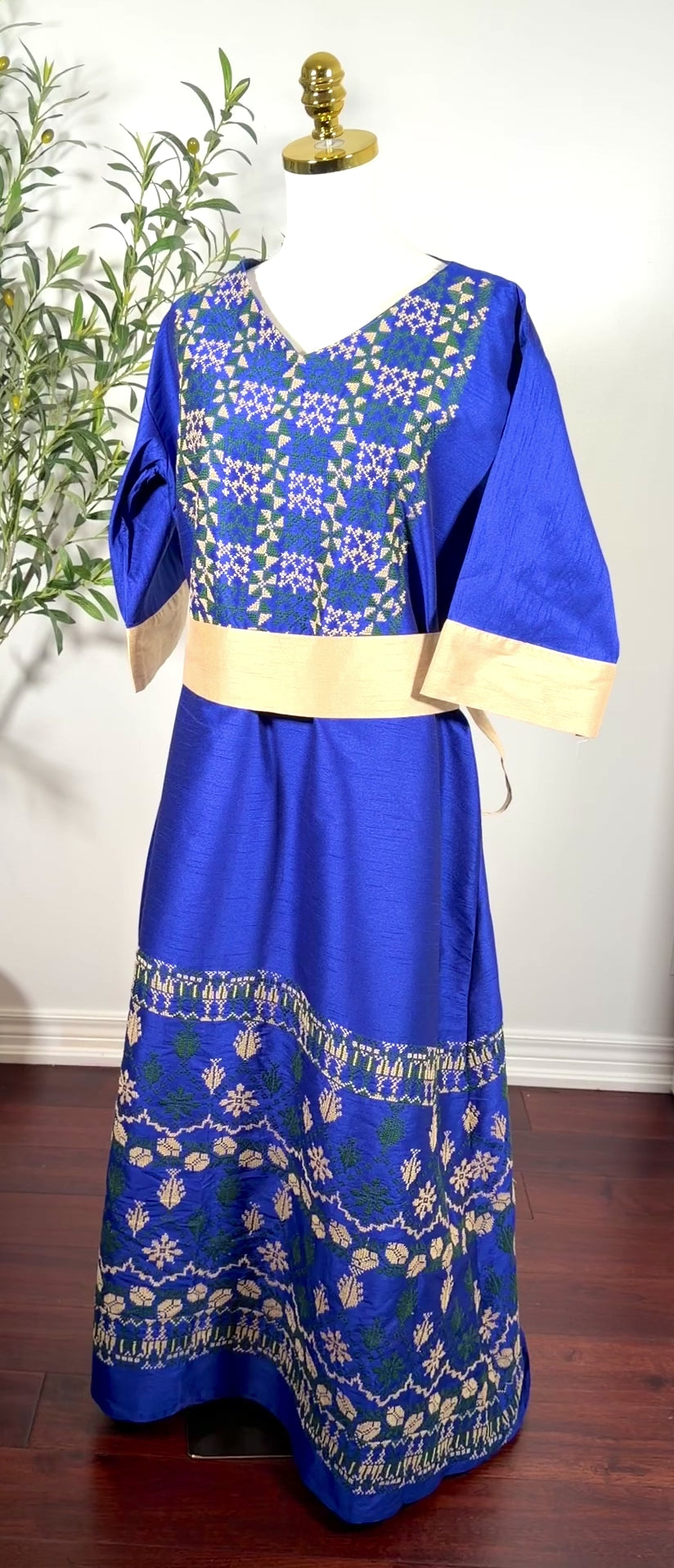 • Rich vibrant blue fabric with green and gold embroidery