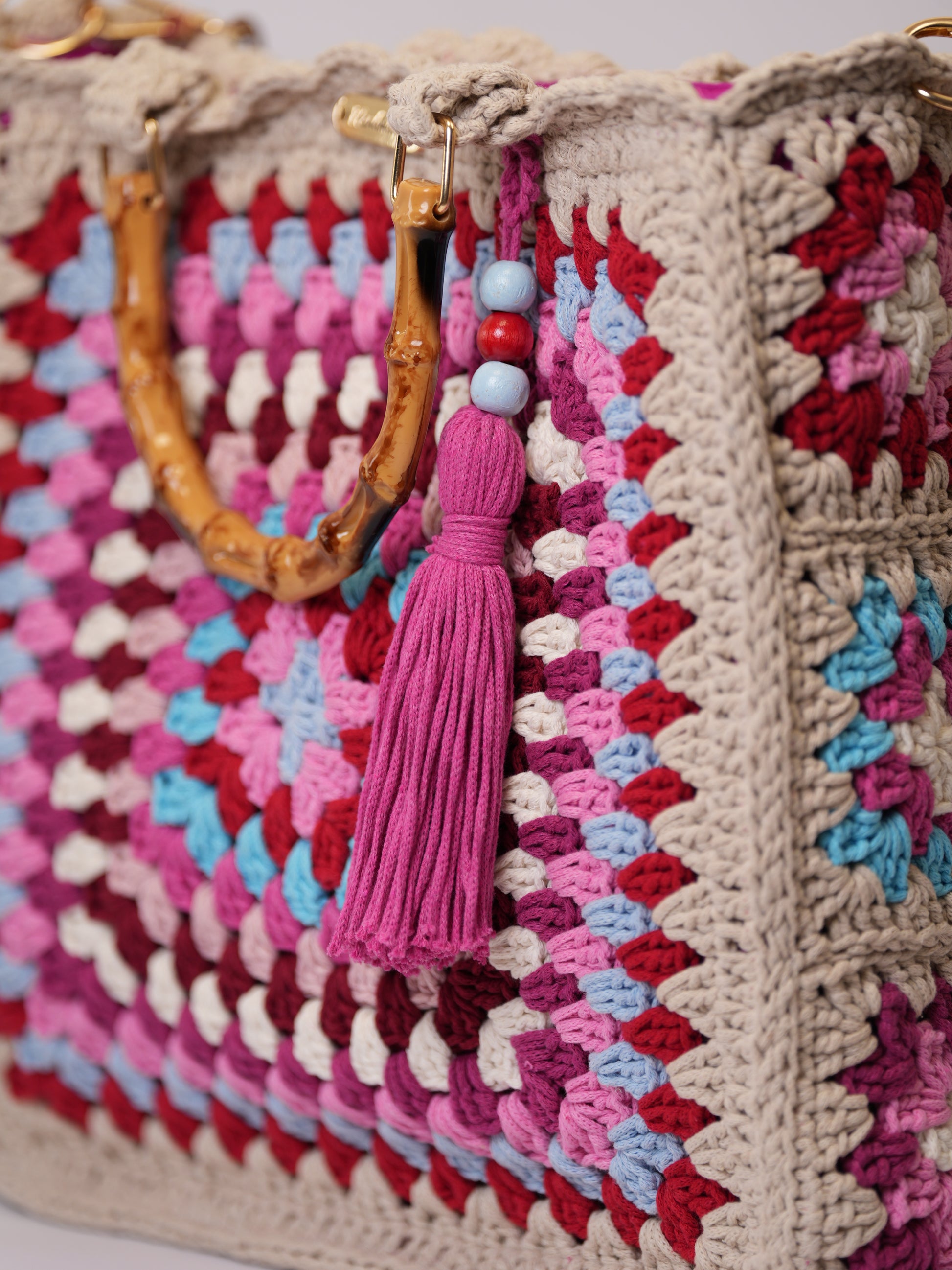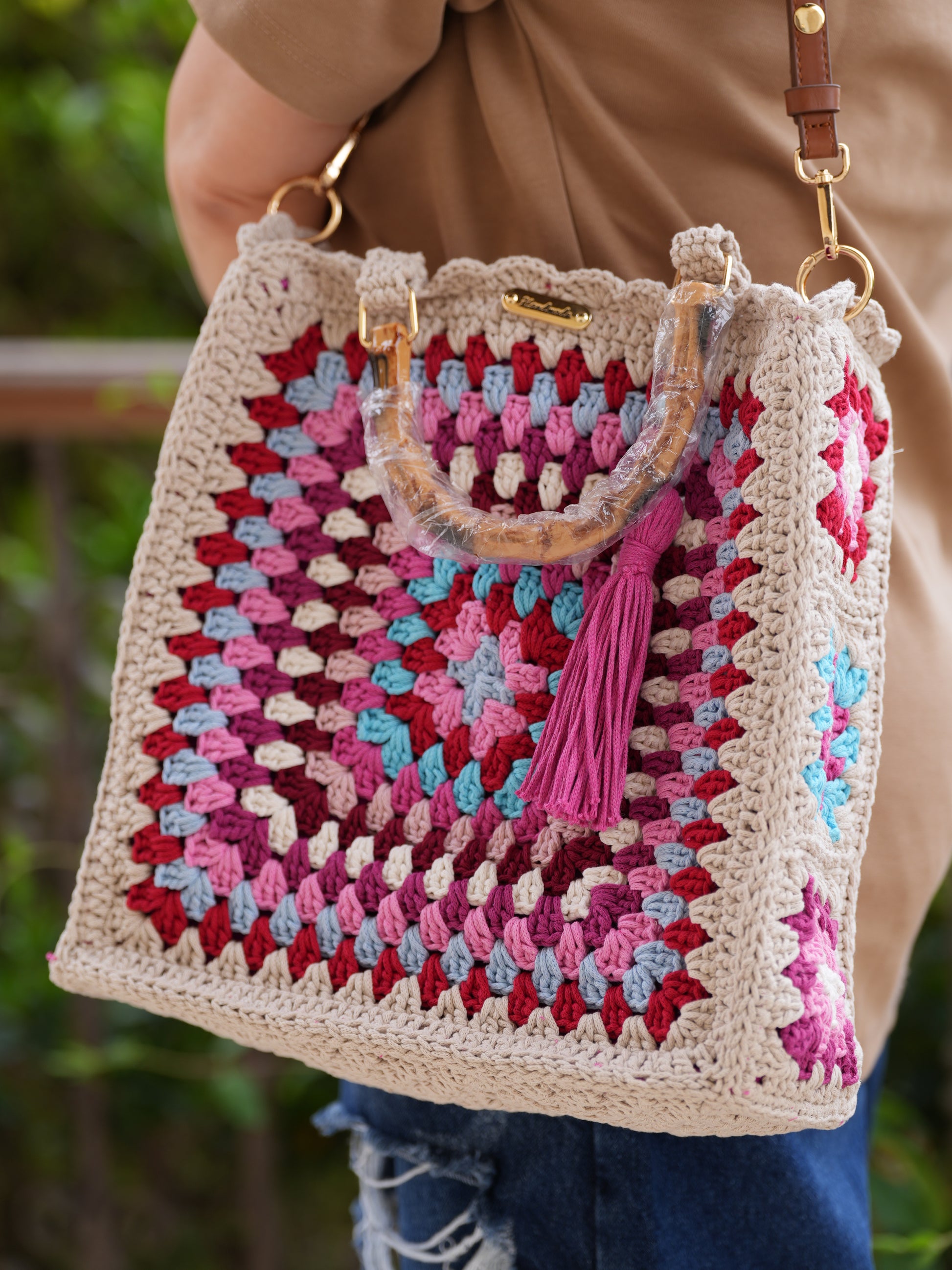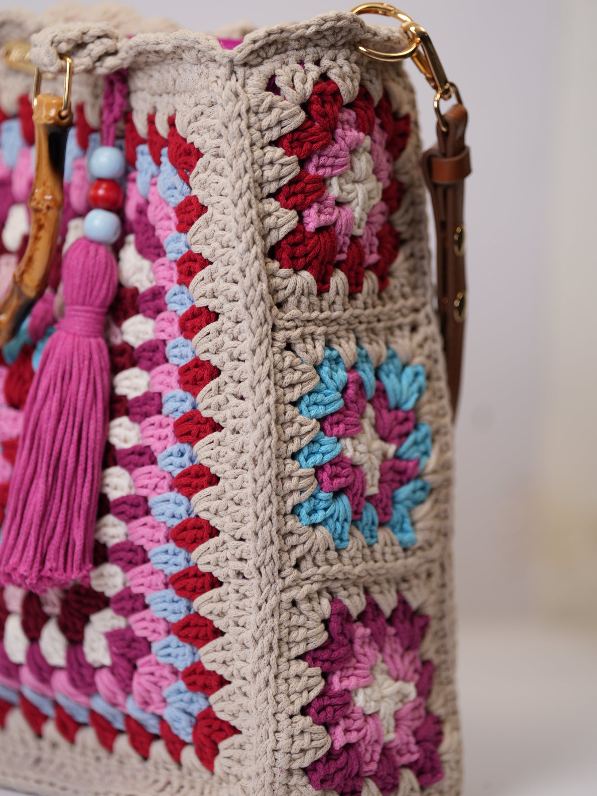 Handmade Pink & Beige Crochet Granny Square Bag | Tatreez Banatna