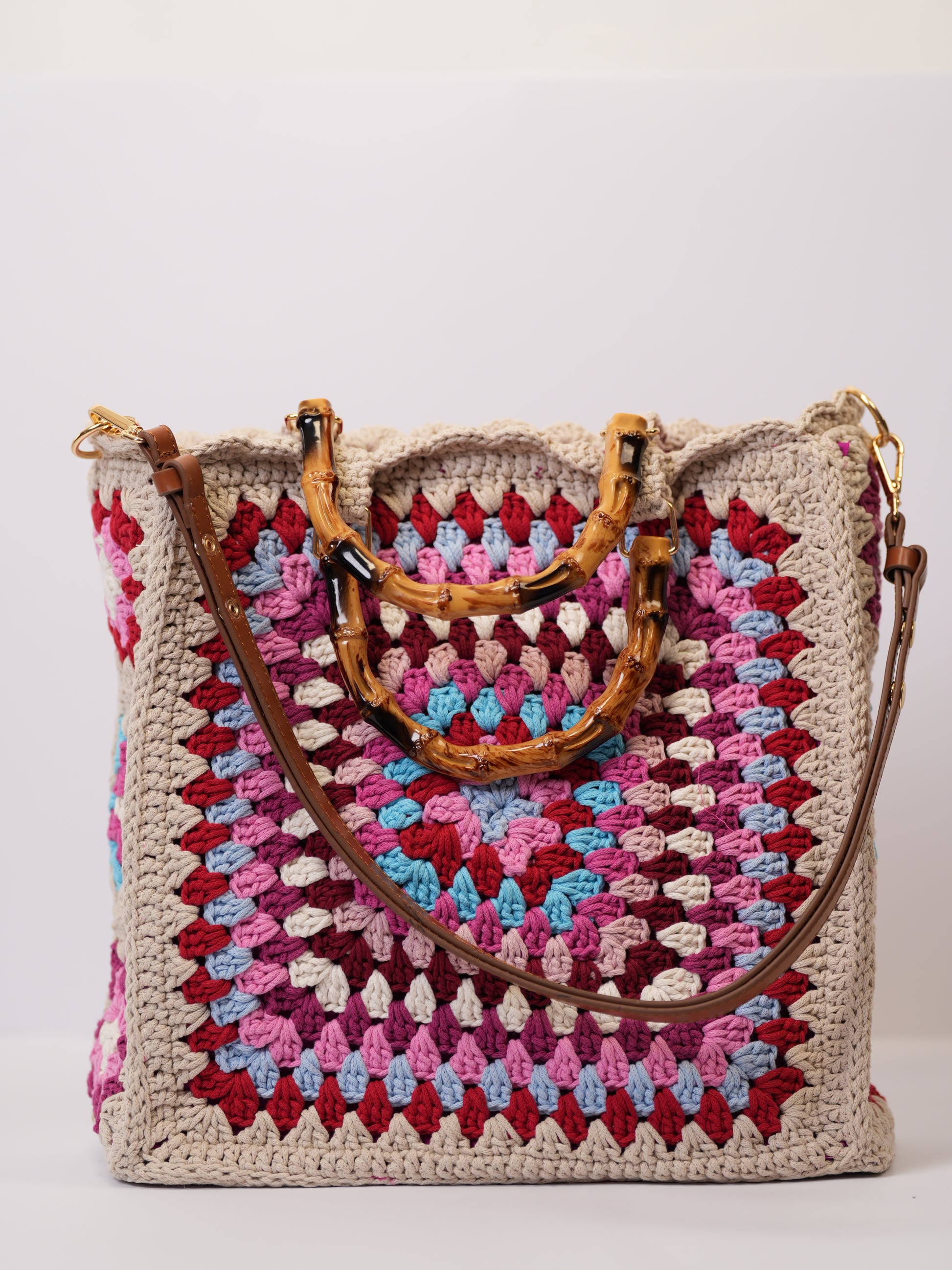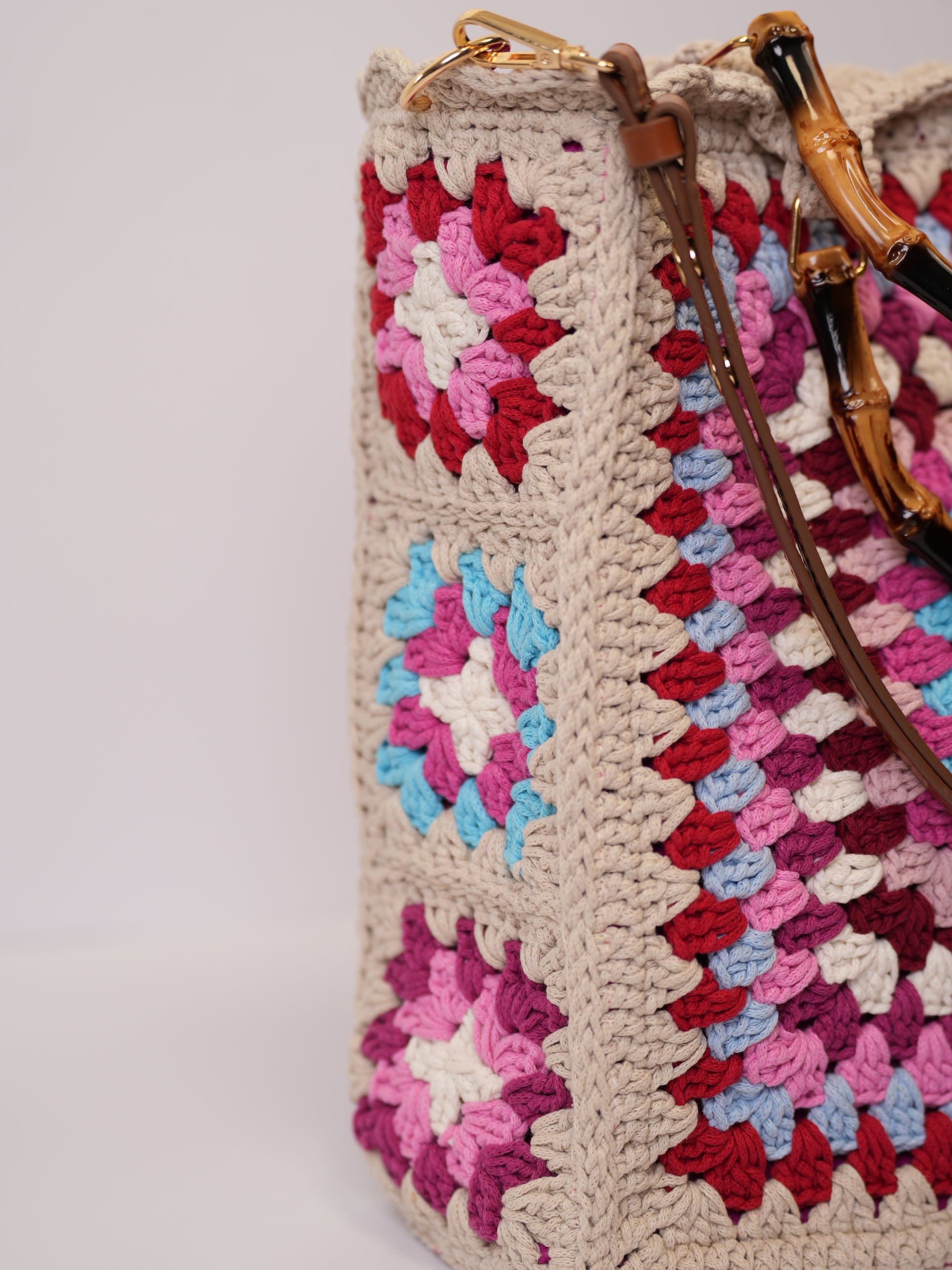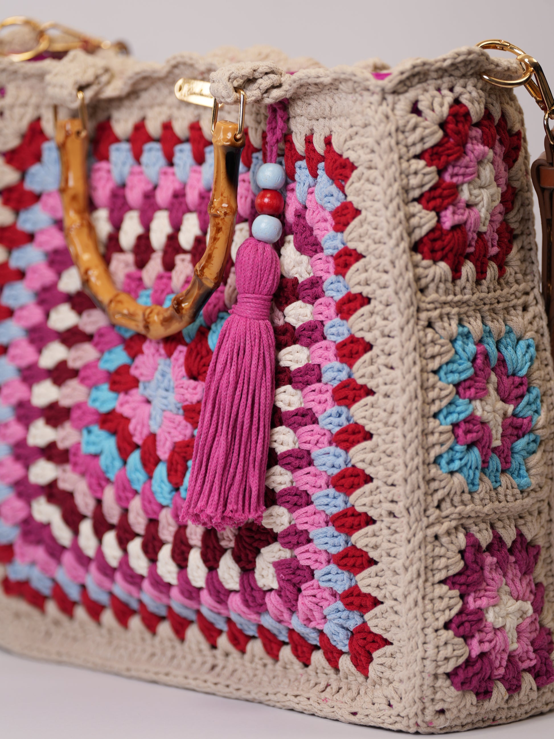 Handmade Pink & Beige Crochet Granny Square Bag | Tatreez Banatna