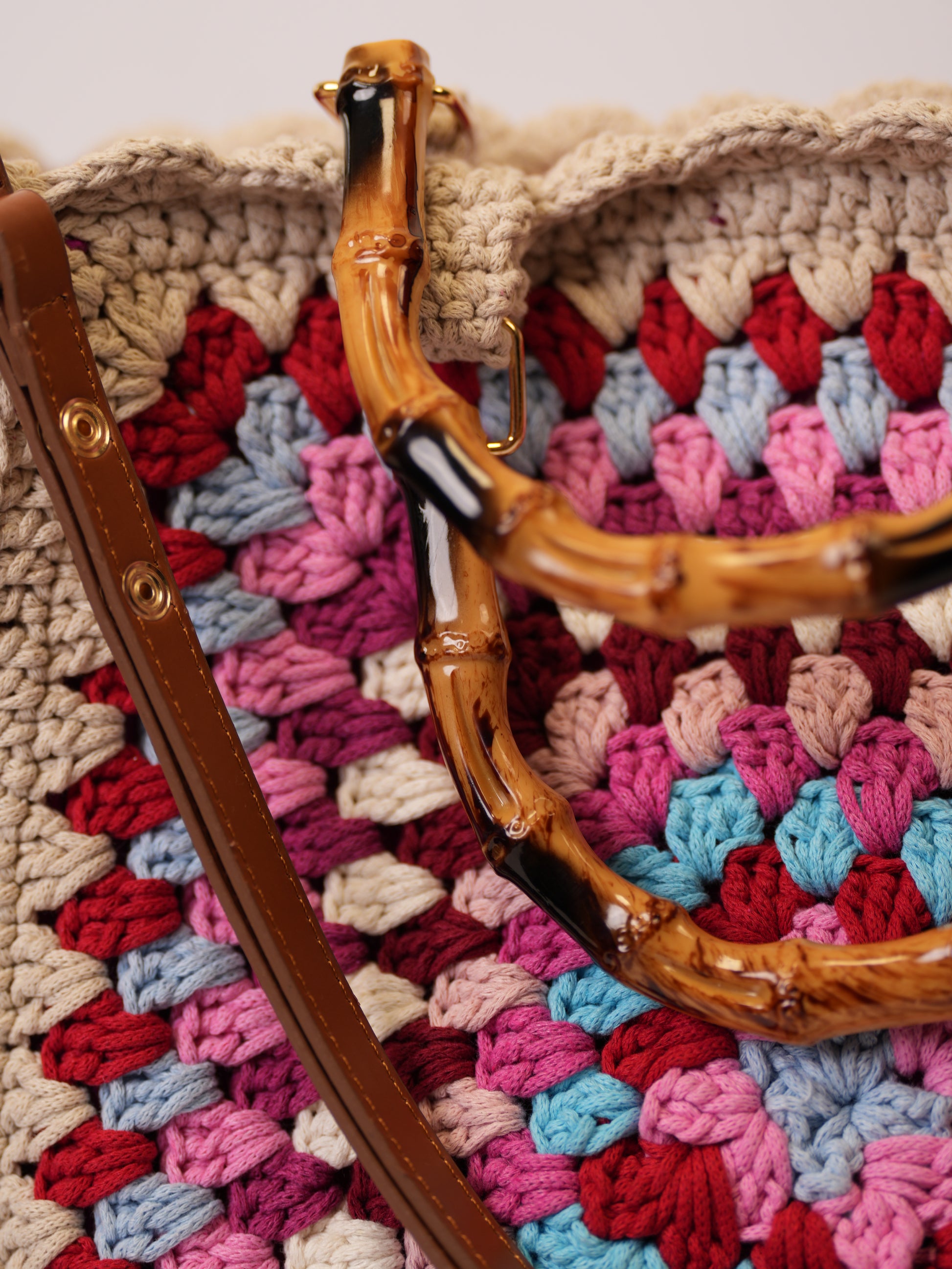 Structured crochet tote made with macramé cotton, built from classic square panels in shades of pink, red, blue, and cream. Finished with a wavy, scalloped edge and clear plastic handles. The inside is lined with smooth fuchsia Barbie fabric for a bright pop of color.