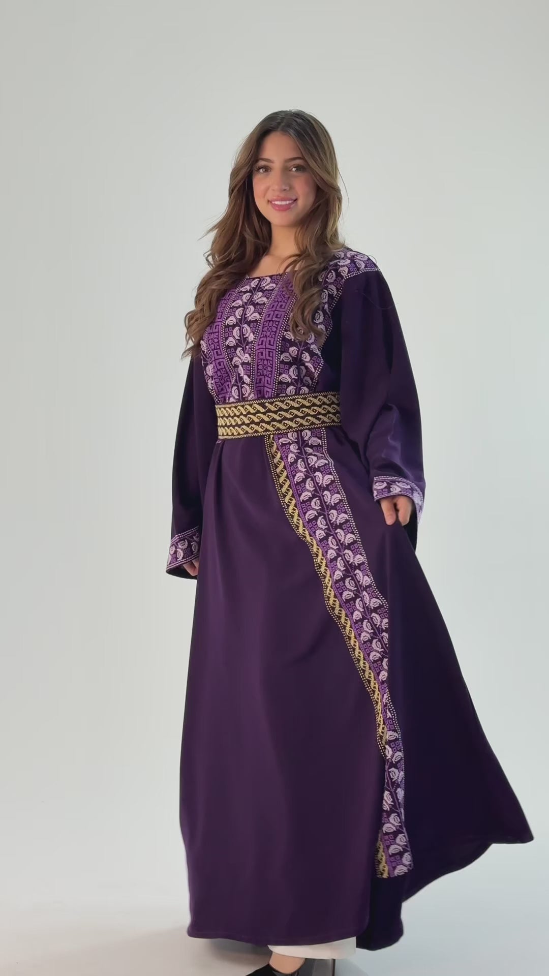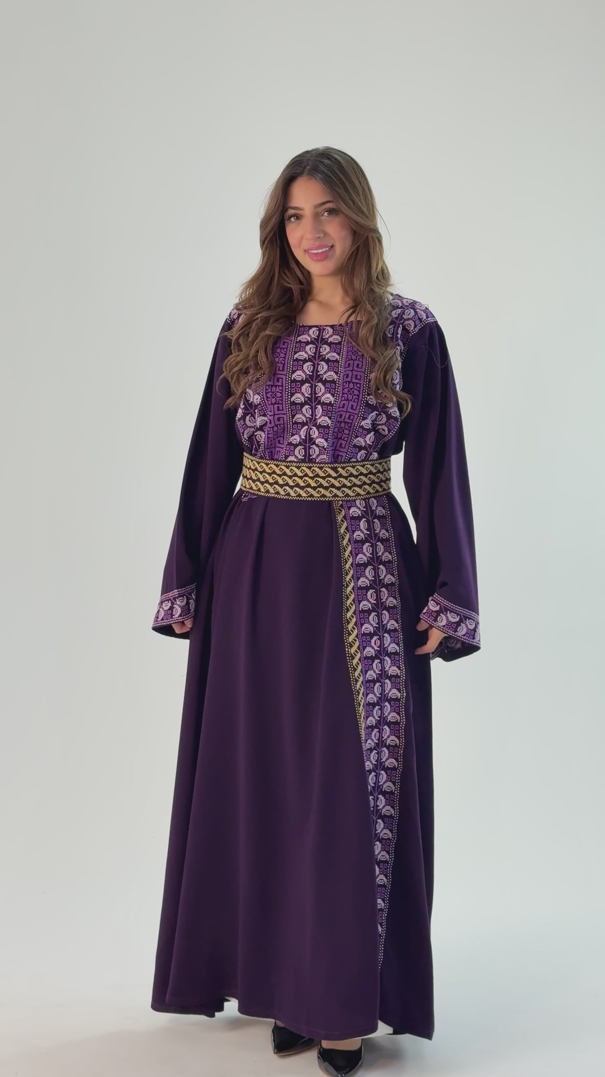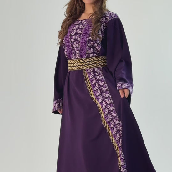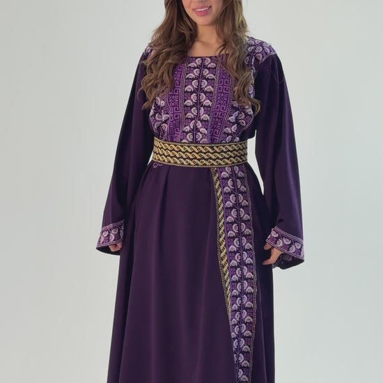 Explore our Handmade Thobe in Crepe Georgette, crafted by Tatreez Banatna with exquisite care. Showcasing lilac hues and authentic Palestinian embroidery, this special piece comes with a stylish belt. Sized at 136cm chest and 145cm length, it offers a blend of traditional artistry and modern design.