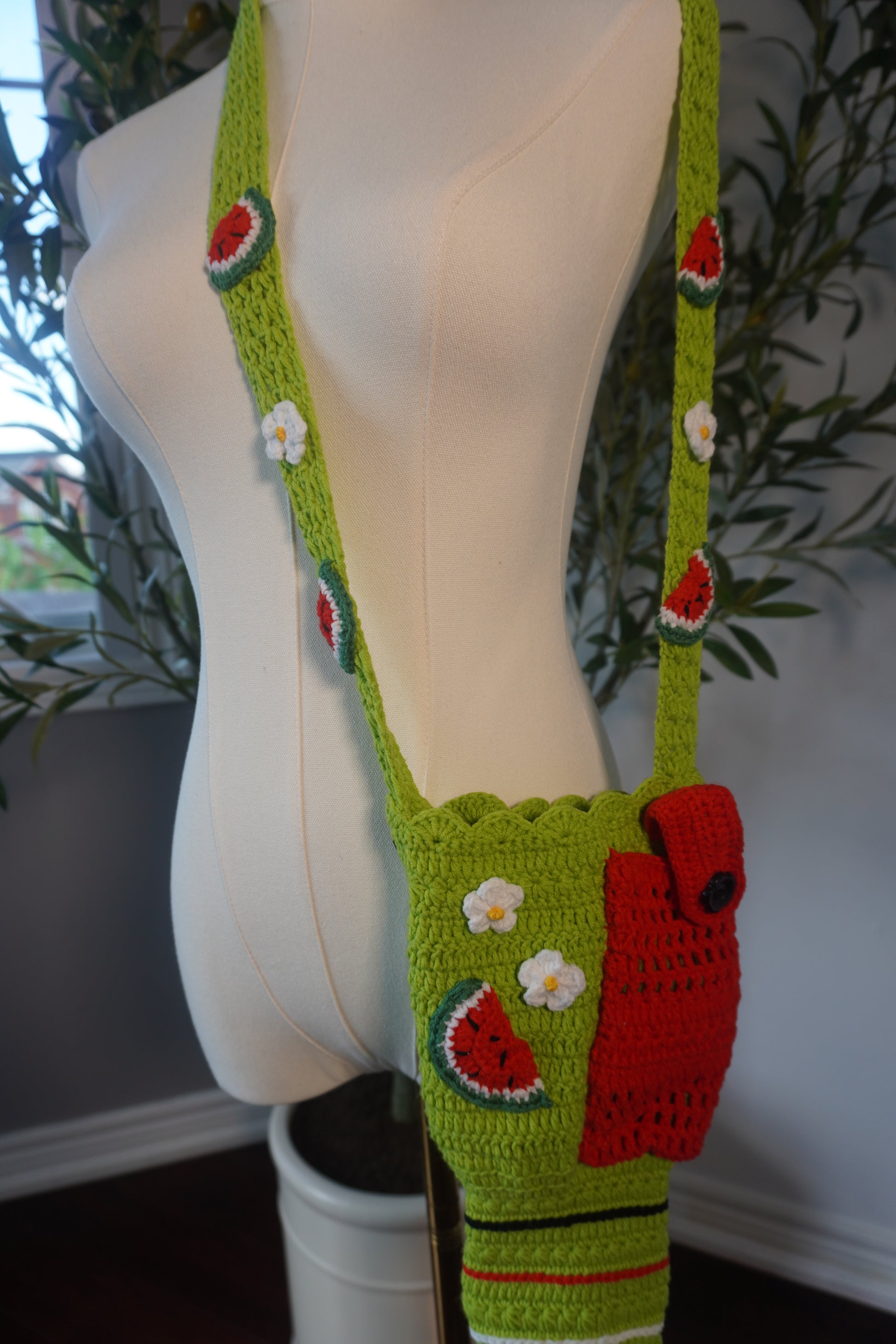 Handmade Crochet Stanley 30oz Bottle Holder - Bright Green Watermelon & White Flowers