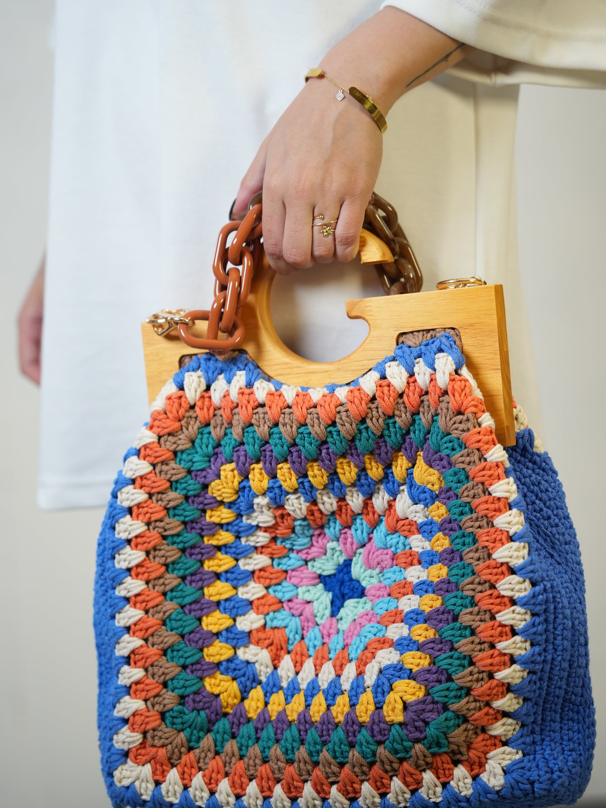 Bold, bright, and beautifully handmade — this eye-catching granny bag features a unique rounded silhouette crafted from soft macramé cotton yarn in vibrant shades of teal and terracotta. Each section is skillfully crocheted in a stunning patchwork that celebrates a blend of tradition and contemporary style.