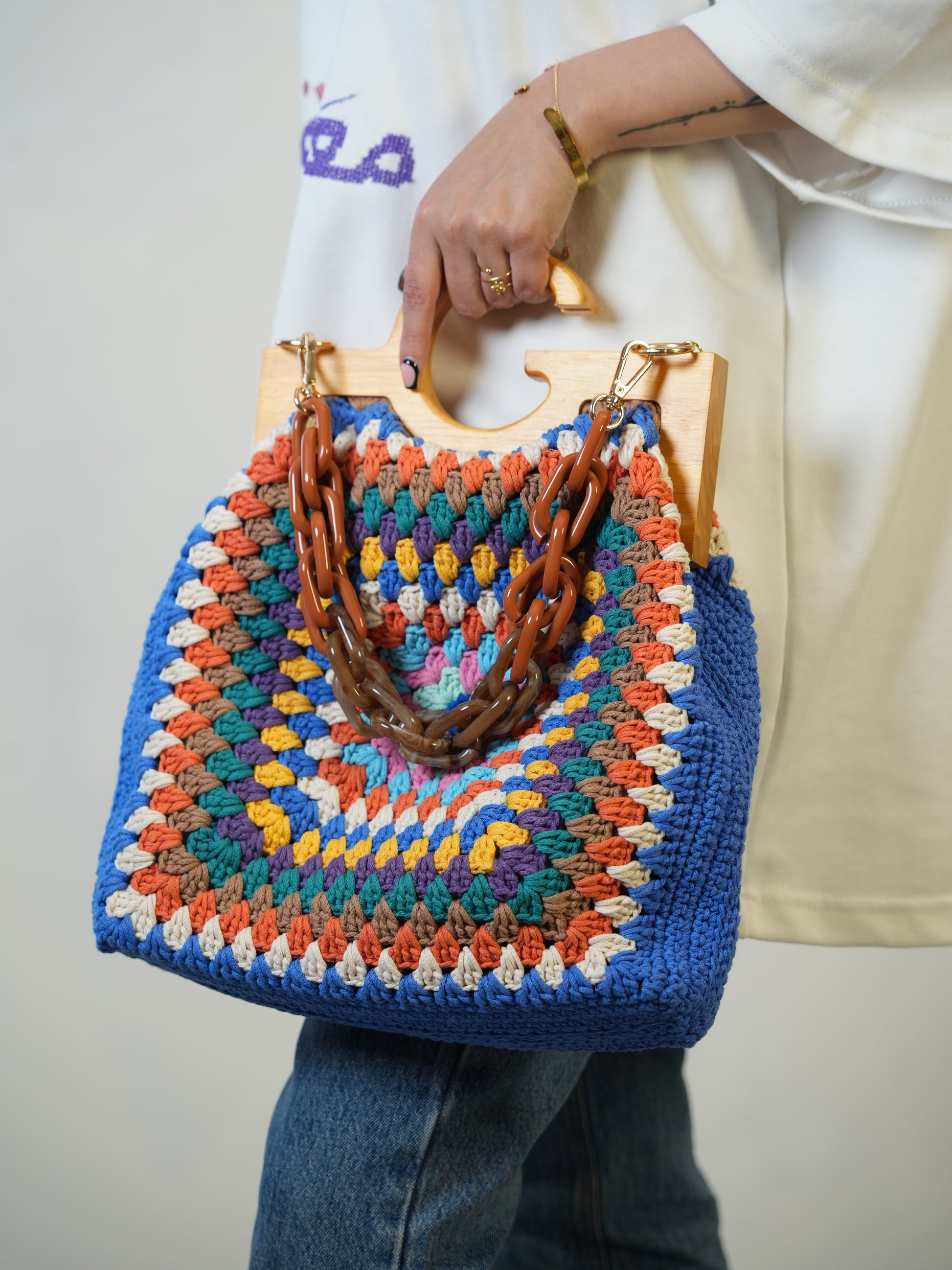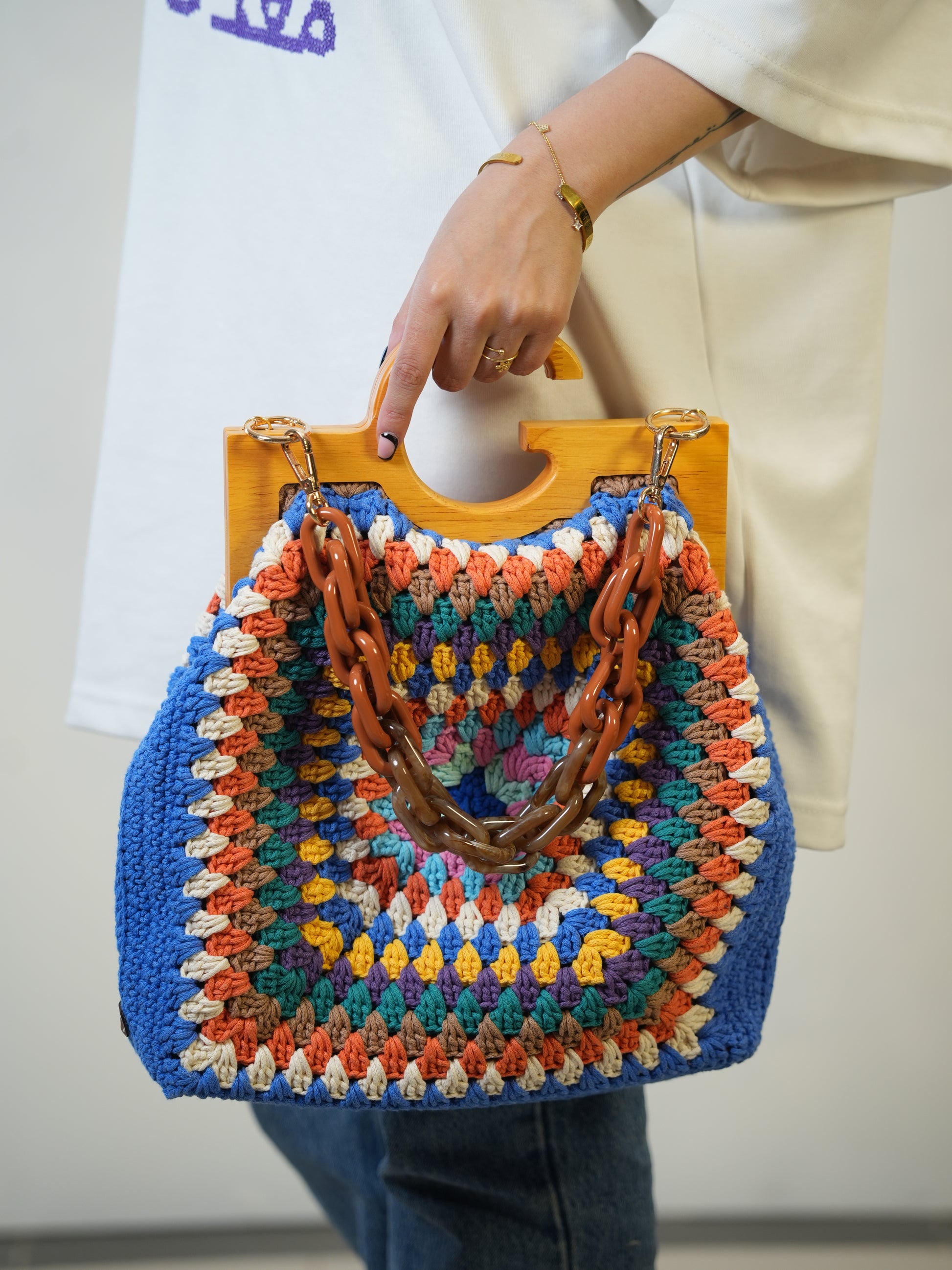 Finished with stylish acrylic chain handles and fully lined with sturdy fabric, this bag is both functional and artistic. Its spacious interior makes it perfect for everything from daily errands to beach days and weekend outings.