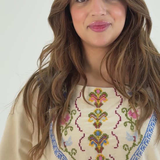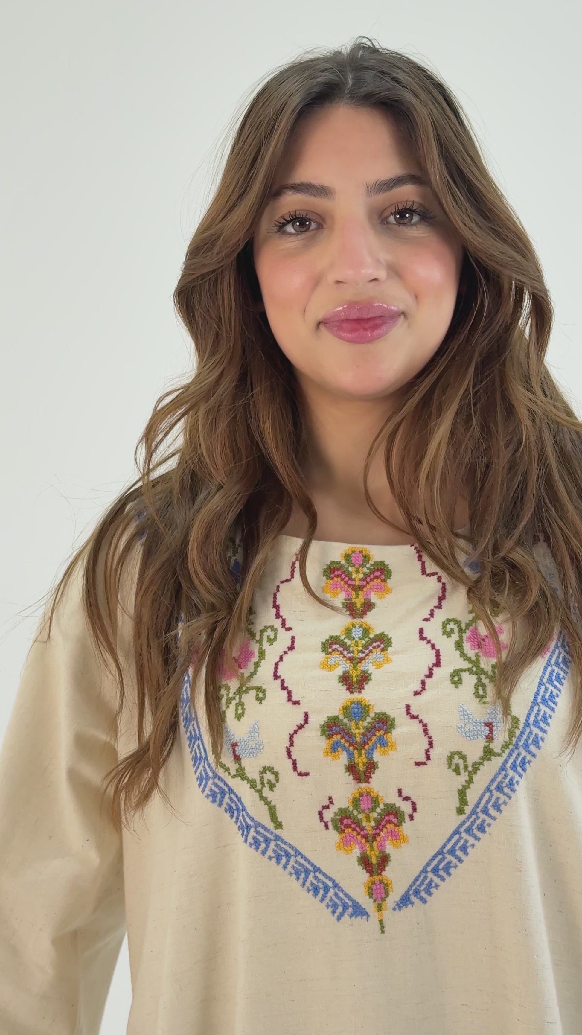 Discover the handcrafted elegance of the "Ammoora – أمورة" Palestinian Tatreez Dress, a timeless piece in a stunning off-white hue made from luxurious georgette fabric. This elegant handmade dress features authentic Palestinian embroidery (Tatreez) with delicate floral motifs inspired by traditional heritage patterns.