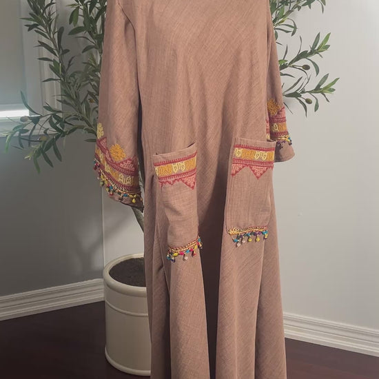 Discover our Handmade Fusion Thoub Beige, featuring exquisite Tatreez embroidery crafted with DMC thread. Made from heavy linen, this piece seamlessly blends traditional artistry with contemporary design, perfect for both casual and formal occasions. Elevate your style with this unique, culturally rich thoub.