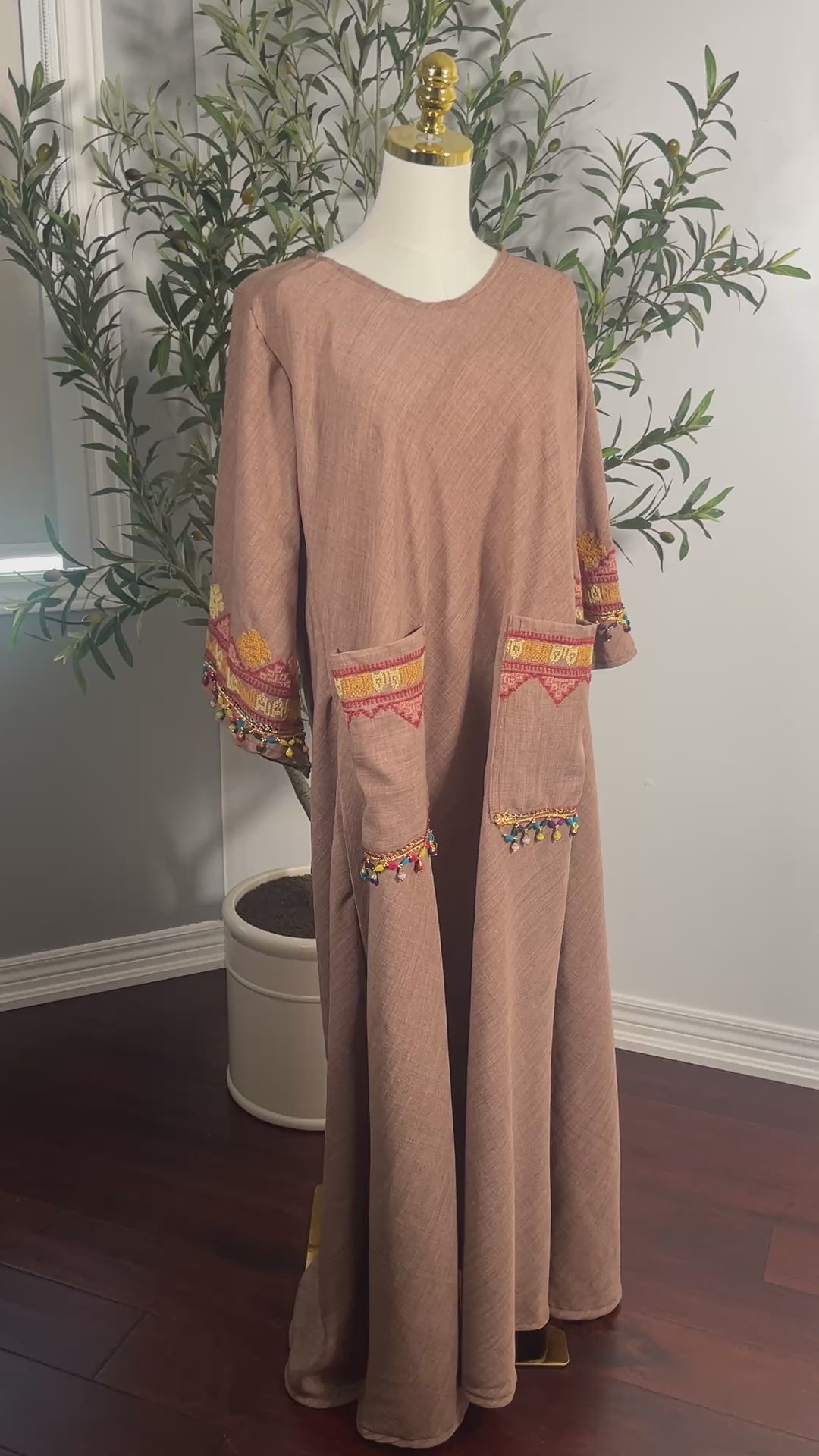 Handmade Fusion Thoub Beige with Tatreez Embroidery - Premium Linen & DMC Thread