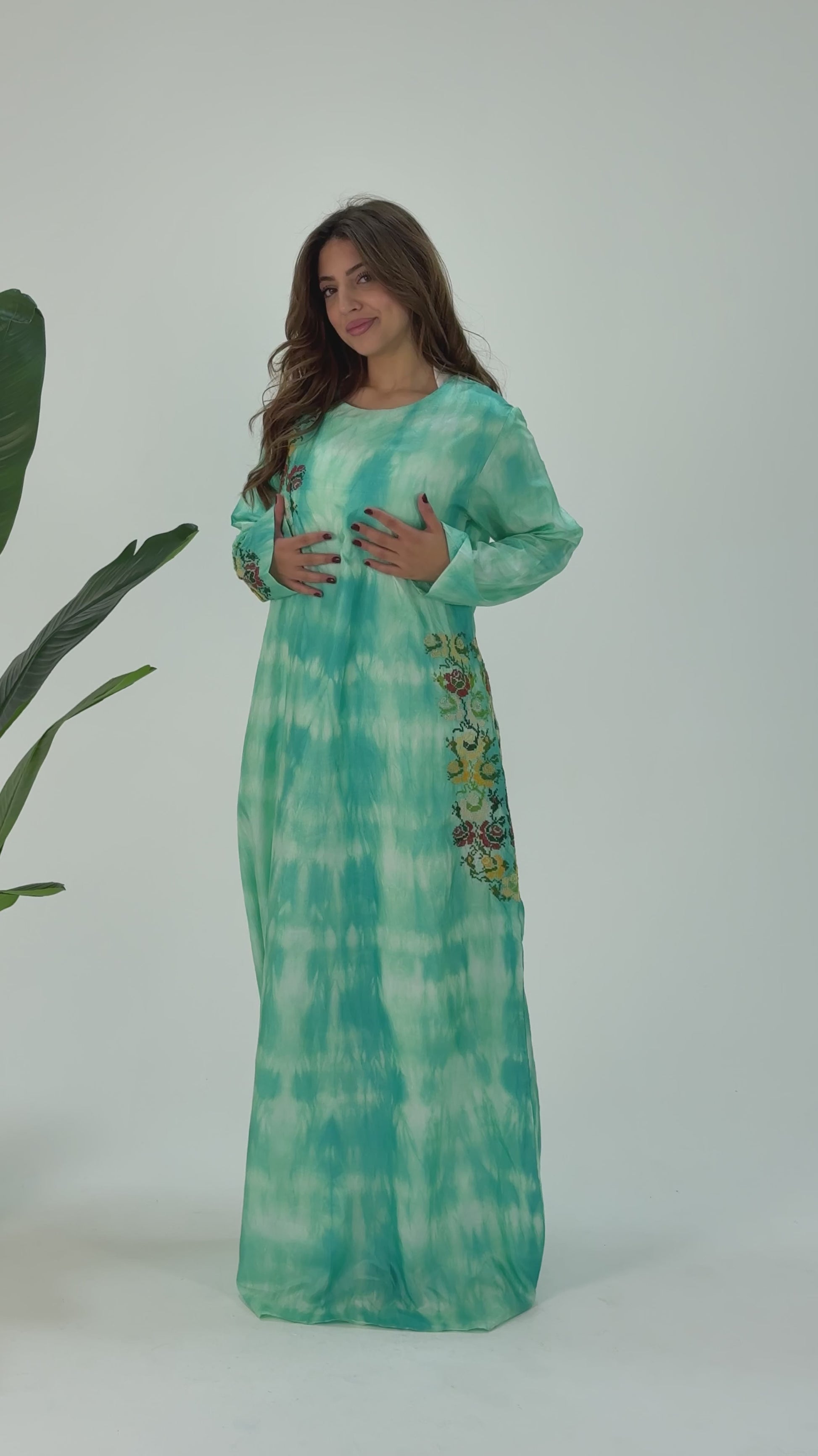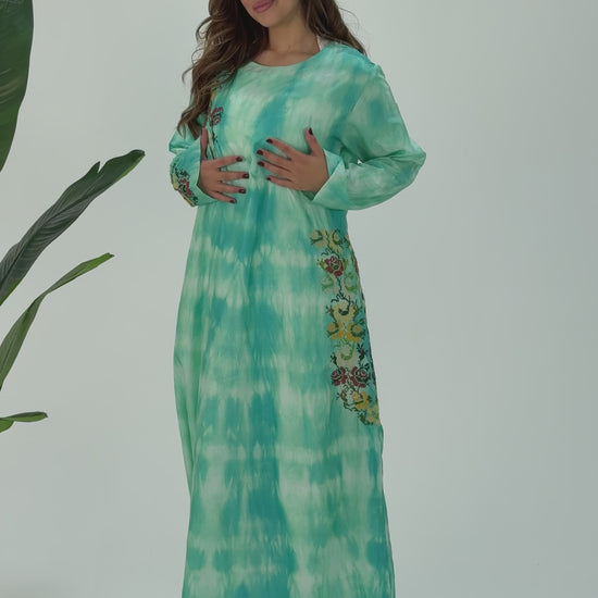 Zaina Light Green Silk Abaya – Handmade Flower Palestinian Tatreez