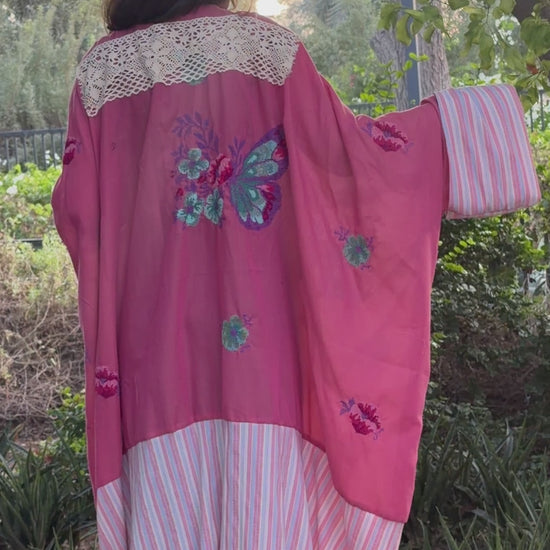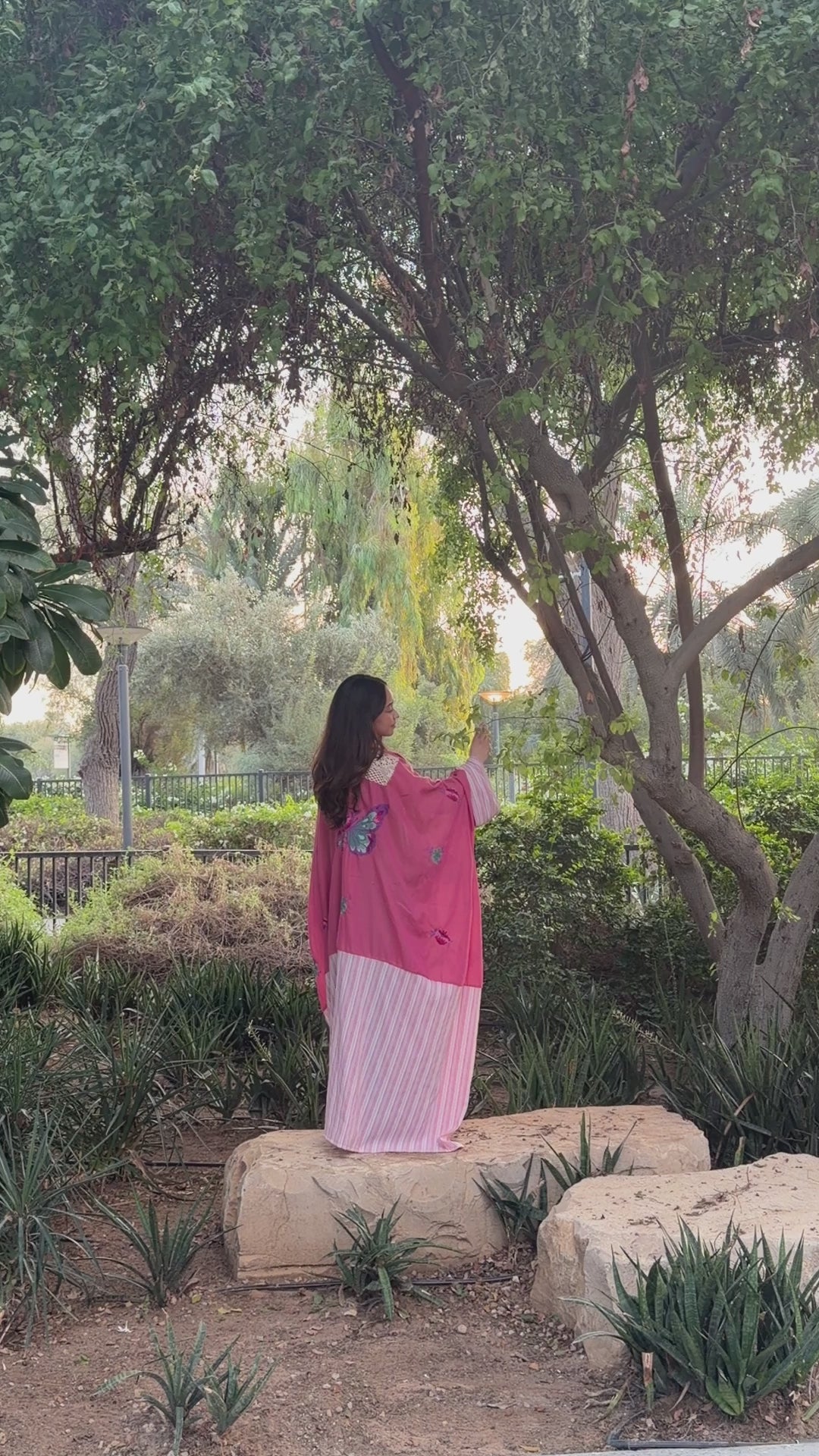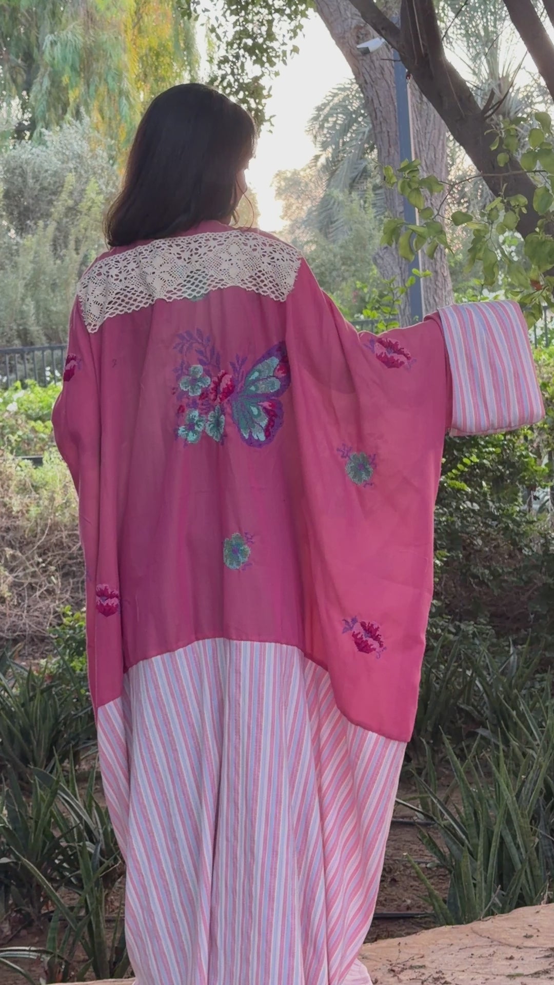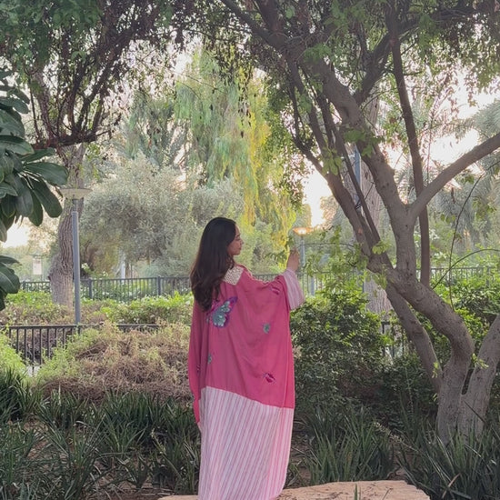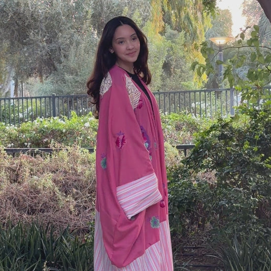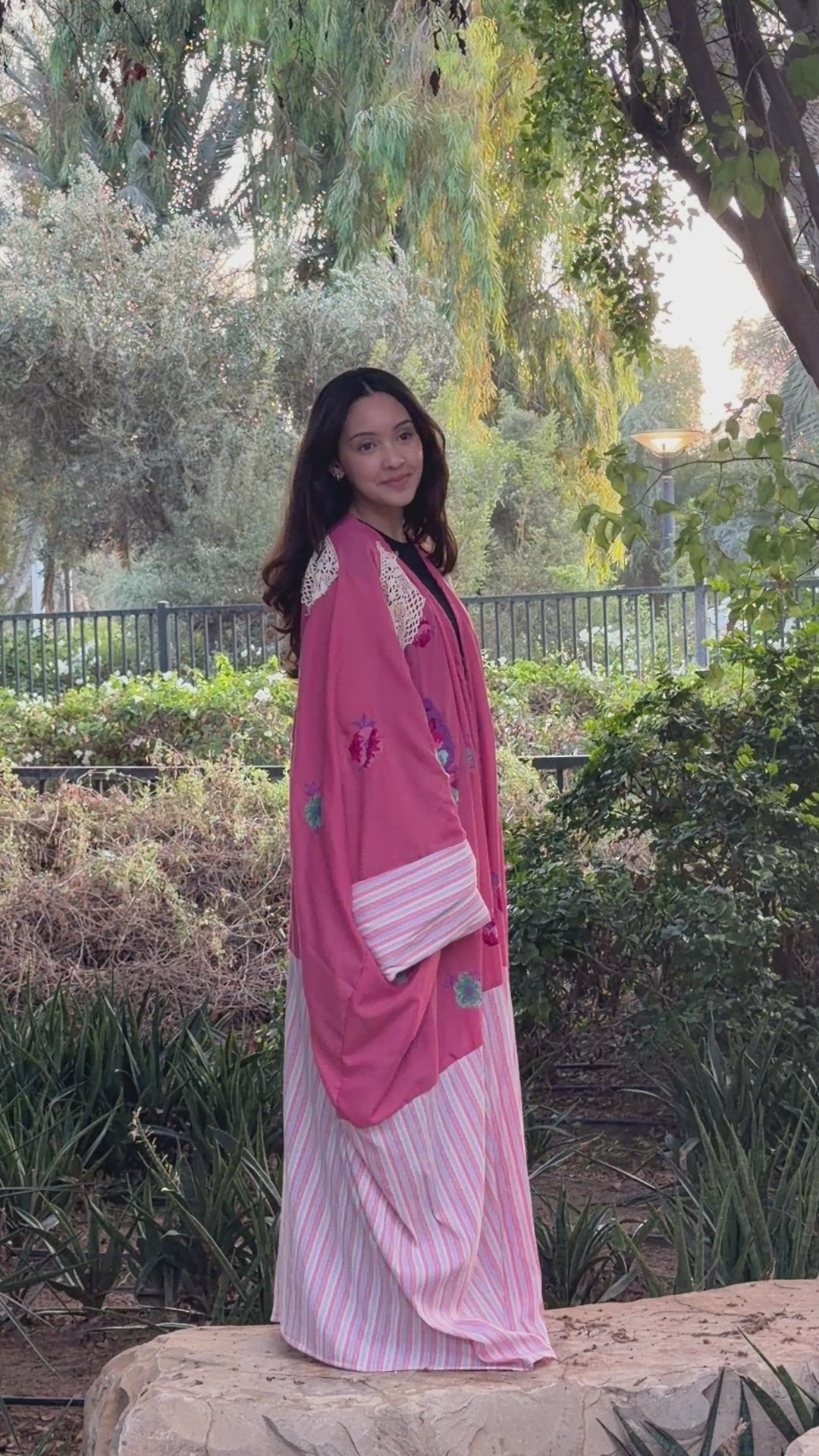 A one-of-a-kind pink bisht adorned with exquisite handmade Palestinian embroidery (tatreez) featuring a stunning butterfly design. The upper fabric is najaf—a soft, silky shine—while the lower part is tetron, a lightweight cotton blend that drapes beautifully.